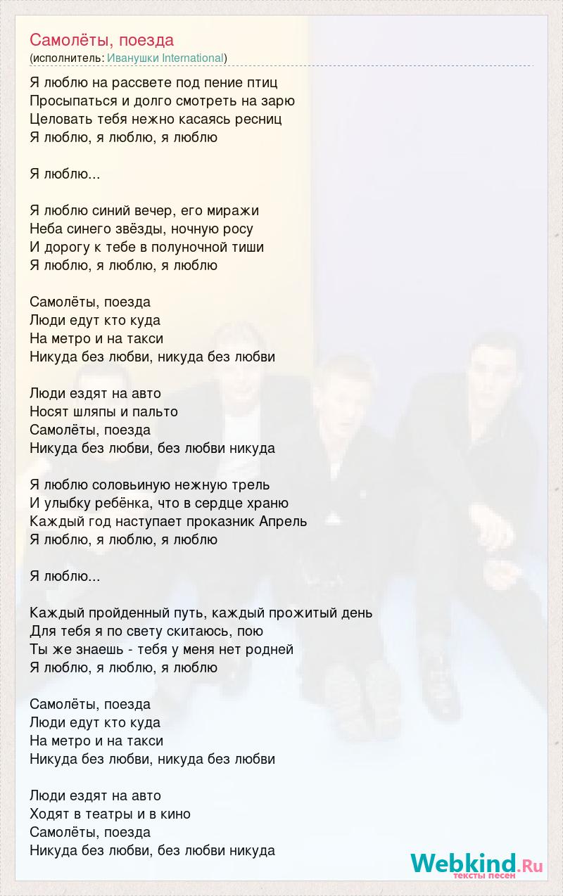 Я люблю на рассвете под пение птиц Просыпаться и долго смотреть на зарю Целовать тебя нежно касаясь ресниц Я люблю, я люблю, я люблю Я люблю... Я люблю синий вечер, его миражи Неба синего звёзды, ночную росу И дорогу к тебе в полуночной тиши Я люблю, я люблю, я люблю Самолёты, поезда Люди едут кто куда На метро и на такси Никуда без любви, никуда без любви Люди ездят на авто Носят шляпы и пальто Самолёты, поезда Никуда без любви, без любви никуда Я люблю соловьиную нежную трель И улыбку ребёнка, что в сердце храню Каждый год наступает проказник Апрель Я люблю, я люблю, я люблю Я люблю... Каждый пройденный путь, каждый прожитый день Для тебя я по свету скитаюсь, пою Ты же знаешь - тебя у меня нет родней Я люблю, я люблю, я люблю Самолёты, поезда Люди едут кто куда На метро и на такси Никуда без любви, никуда без любви Люди ездят на авто Ходят в театры и в кино Самолёты, поезда Никуда без любви, без любви никуда