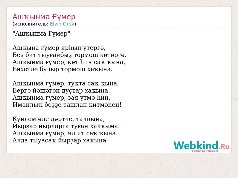 "Ашҡынма Ғүмер" Ашҡына ғүмер ярһып үтергә, Беҙ бит тыуғанбыҙ тормош көтөргә. Ашҡынма ғүмер, көт һин саҡ ҡына, Бәхетле булыр тормош хаҡына. Ашҡынма ғүмер, туҡта саҡ ҡына, Бергә йәшәгән дуҫтар хаҡына. Ашҡынма ғүмер, зая үтмә һин, Иманлыҡ беҙҙе ташлап китмәһен! Күңлем әле дәртле, талпына, Йырҙар йырларга туған халҡыма. Ашҡынма ғүмер, ял ит саҡ ҡына. Алда тыуасаҡ йырҙар хаҡына