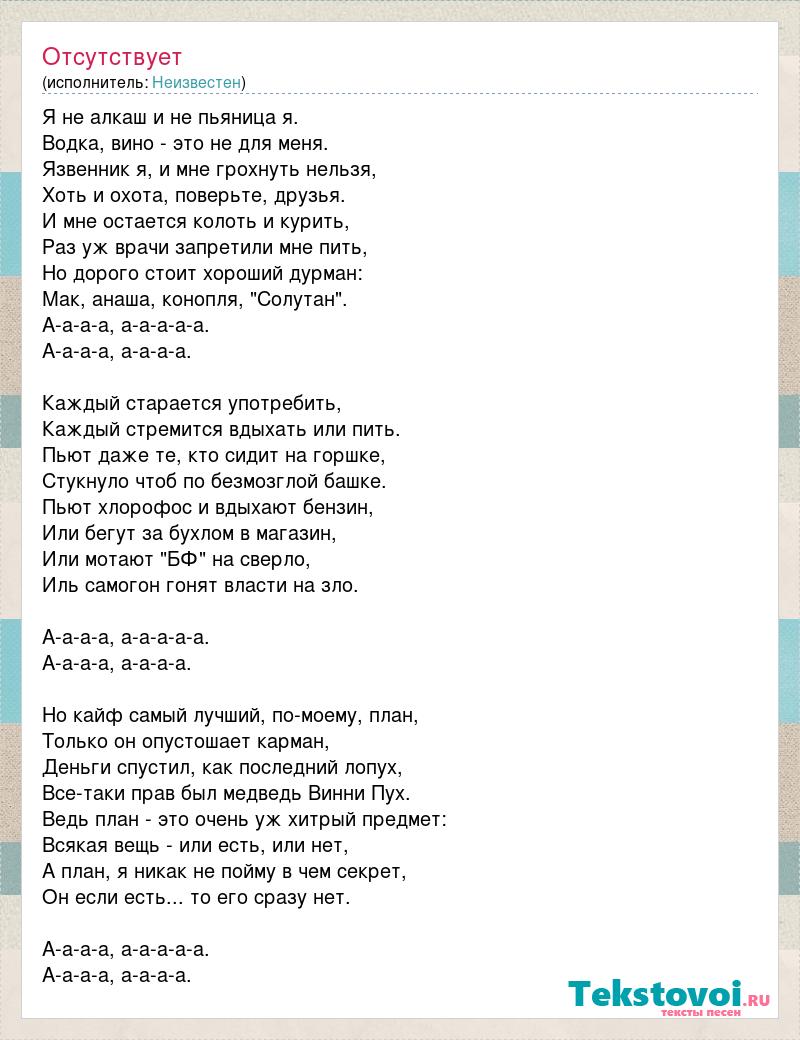 Я не алкаш и не пьяница я. Водка, вино - это не для меня. Язвенник я, и мне грохнуть нельзя, Хоть и охота, поверьте, друзья. И мне остается колоть и курить, Раз уж врачи запретили мне пить, Но дорого стоит хороший дурман: Мак, анаша, конопля, "Солутан". А-а-а-а, а-а-а-а-а. А-а-а-а, а-а-а-а. Каждый старается употребить, Каждый стремится вдыхать или пить. Пьют даже те, кто сидит на горшке, Стукнуло чтоб по безмозглой башке. Пьют хлорофос и вдыхают бензин, Или бегут за бухлом в магазин, Или мотают "БФ" на сверло, Иль самогон гонят власти на зло. А-а-а-а, а-а-а-а-а. А-а-а-а, а-а-а-а. Но кайф самый лучший, по-моему, план, Только он опустошает карман, Деньги спустил, как последний лопух, Все-таки прав был медведь Винни Пух. Ведь план - это очень уж хитрый предмет: Всякая вещь - или есть, или нет, А план, я никак не пойму в чем секрет, Он если есть... то его сразу нет. А-а-а-а, а-а-а-а-а. А-а-а-а, а-а-а-а.