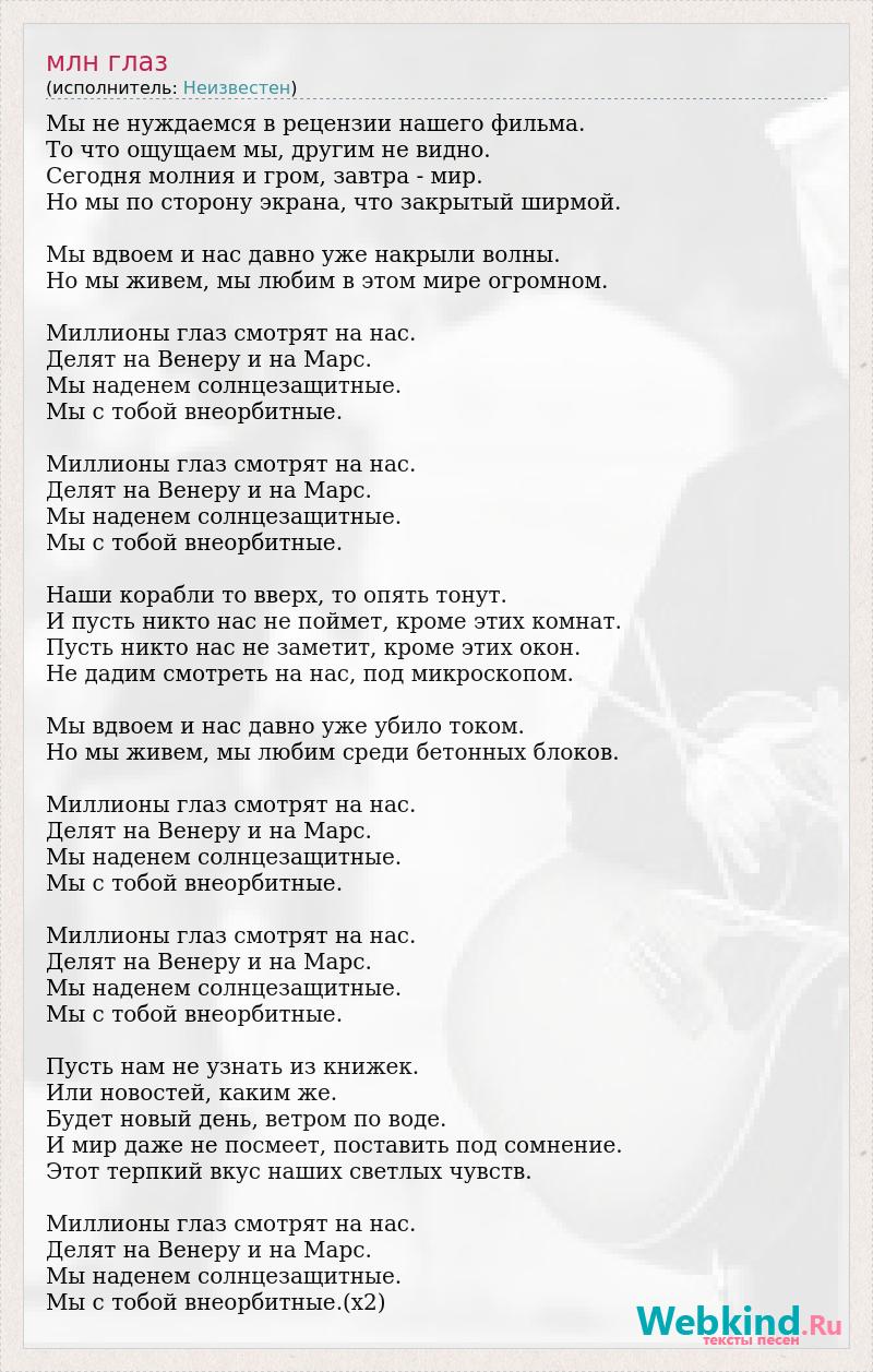 Мы не нуждаемся в рецензии нашего фильма. То что ощущаем мы, другим не видно. Сегодня молния и гром, завтра - мир. Но мы по сторону экрана, что закрытый ширмой. Мы вдвоем и нас давно уже накрыли волны. Но мы живем, мы любим в этом мире огромном. Миллионы глаз смотрят на нас. Делят на Венеру и на Марс. Мы наденем солнцезащитные. Мы с тобой внеорбитные. Миллионы глаз смотрят на нас. Делят на Венеру и на Марс. Мы наденем солнцезащитные. Мы с тобой внеорбитные. Наши корабли то вверх, то опять тонут. И пусть никто нас не поймет, кроме этих комнат. Пусть никто нас не заметит, кроме этих окон. Не дадим смотреть на нас, под микроскопом. Мы вдвоем и нас давно уже убило током. Но мы живем, мы любим среди бетонных блоков. Миллионы глаз смотрят на нас. Делят на Венеру и на Марс. Мы наденем солнцезащитные. Мы с тобой внеорбитные. Миллионы глаз смотрят на нас. Делят на Венеру и на Марс. Мы наденем солнцезащитные. Мы с тобой внеорбитные. Пусть нам не узнать из книжек. Или новостей, каким же. Будет новый день, ветром по воде. И мир даже не посмеет, поставить под сомнение. Этот терпкий вкус наших светлых чувств. Миллионы глаз смотрят на нас. Делят на Венеру и на Марс. Мы наденем солнцезащитные. Мы с тобой внеорбитные.(х2)