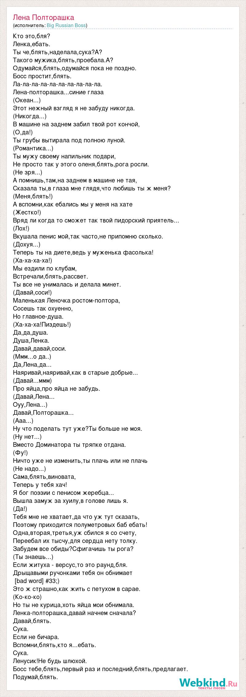 Кто это,бля? Ленка,ебать. Ты че,блять,наделала,сука?А? Такого мужика,блять,проебала.А? Одумайся,блять,одумайся пока не поздно. Босс простит,блять. Ла-ла-ла-ла-ла-ла-ла-ла-ла-ла. Лена-полторашка...синие глаза (Океан...) Этот нежный взгляд я не забуду никогда. (Никогда...) В машине на заднем забил твой рот кончой, (О,да!) Ты грубы вытирала под полною луной. (Романтика...) Ты мужу своему напильник подари, Не просто так у этого оленя,блять,рога росли. (Не зря...) А помнишь,там,на заднем в машине не тая, Сказала ты,в глаза мне глядя,что любишь ты ж меня? (Меня,блять!) А вспомни,как ебались мы у меня на хате (Жестко!) Вряд ли когда то сможет так твой пидорский приятель... (Лох!) Вкушала пенис мой,так часто,не припомню сколько. (Дохуя...) Теперь ты на диете,ведь у муженька фасолька! (Ха-ха-ха-ха!) Мы ездили по клубам, Встречали,блять,рассвет. Ты все не унималась и делала минет. (Давай,соси!) Маленькая Леночка ростом-полтора, Сосешь так охуенно, Но главное-душа. (Ха-ха-ха!Пиздешь!) Да,да,душа. Душа,Ленка. Давай,давай,соси. (Ммм...о да..) Да,Лена,да... Наяривай,наяривай,как в старые добрые... (Давай...ммм) Про яйца,про яйца не забудь. (Давай,Лена... Оуу,Лена...) Давай,Полторашка... (Ааа...) Ну что поделать тут уже?Ты больше не моя. (Ну нет...) Вместо Доминатора ты тряпке отдана. (Фу!) Ничто уже не изменить,ты плачь или не плачь (Не надо...) Сама,блять,виновата, Теперь у тебя хач! Я бог поэзии с пенисом жеребца... Вышла замуж за хуилу,в голове лишь я. (Да!) Тебя мне не хватает,да что уж тут сказать, Поэтому приходится полуметровых баб ебать! Одна,вторая,третья,уж сбился я со счету, Переебал их тысчу,для сердца нету толку. Забудем все обиды?Сфигачишь ты рога? (Ты знаешь...) Если житуха - версус,то это раунд,бля. Дрыщавыми ручонками тебя он обнимает [bad word] #33;) Это ж страшно,как жить с петухом в сарае. (Ко-ко-ко) Но ты не курица,хоть яйца мои обнимала. Ленка-полторашка,давай начнем сначала? Давай,блять. Сука. Если не бичара. Вспомни,блять,кто я...ебать. Сука. Ленусик!Не будь шлюхой. Босс тебе,блять,первый раз и последний,блять,предлагает. Подумай,блять.