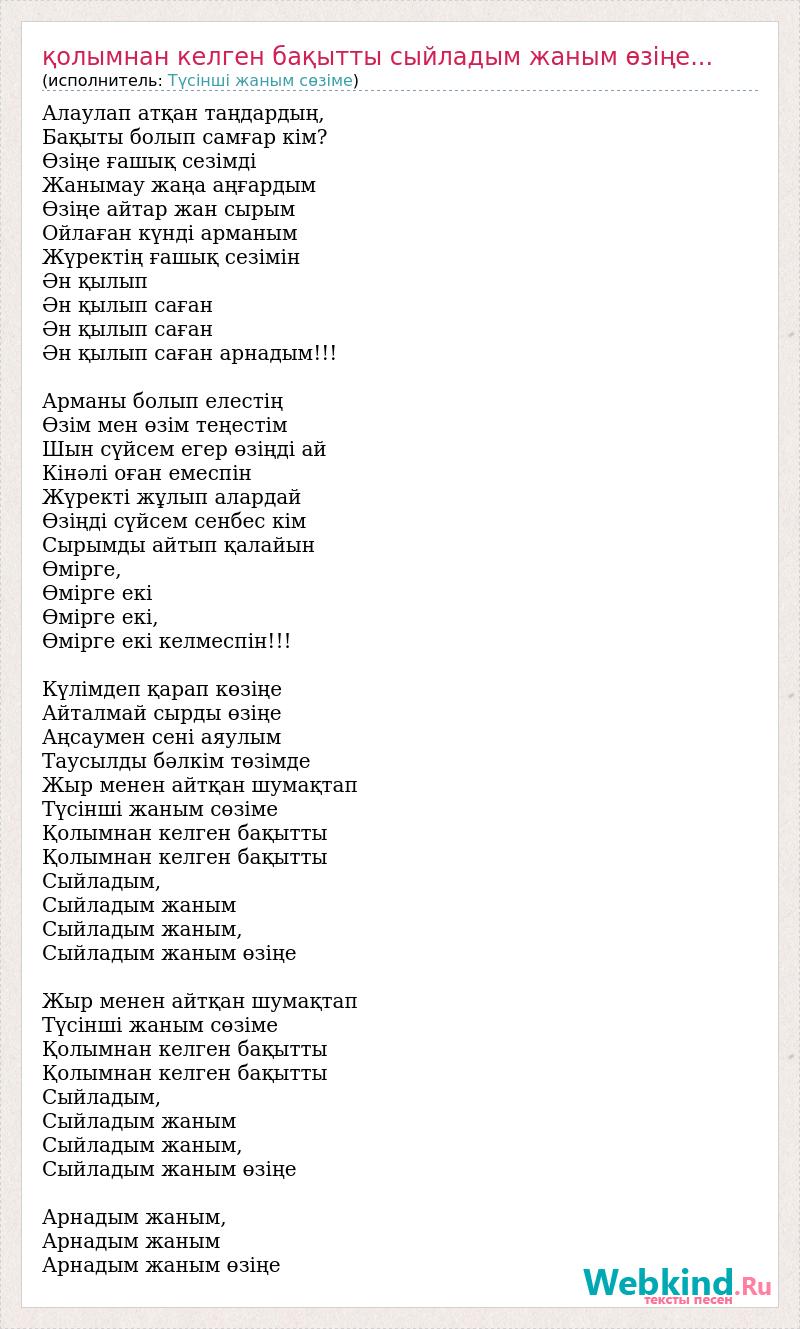 Алаулап атқан таңдардың, Бақыты болып самғар кім? Өзіңе ғашық сезімді Жанымау жаңа аңғардым Өзіңе айтар жан сырым Ойлаған күнді арманым Жүректің ғашық сезімін Ән қылып Ән қылып саған Ән қылып саған Ән қылып саған арнадым!!! Арманы болып елестің Өзім мен өзім теңестім Шын сүйсем егер өзіңді ай Кінәлі оған емеспін Жүректі жұлып алардай Өзіңді сүйсем сенбес кім Сырымды айтып қалайын Өмірге, Өмірге екі Өмірге екі, Өмірге екі келмеспін!!! Күлімдеп қарап көзіңе Айталмай сырды өзіңе Аңсаумен сені аяулым Таусылды бәлкім төзімде Жыр менен айтқан шумақтап Түсінші жаным сөзіме Қолымнан келген бақытты Қолымнан келген бақытты Сыйладым, Сыйладым жаным Сыйладым жаным, Сыйладым жаным өзіңе Жыр менен айтқан шумақтап Түсінші жаным сөзіме Қолымнан келген бақытты Қолымнан келген бақытты Сыйладым, Сыйладым жаным Сыйладым жаным, Сыйладым жаным өзіңе Арнадым жаным, Арнадым жаным Арнадым жаным өзіңе
