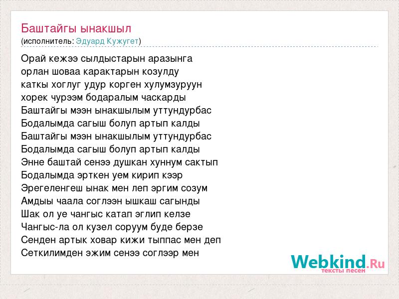 Орай кежээ сылдыстарын аразынга орлан шоваа карактарын козулду каткы хоглуг удур корген хулумзуруун хорек чурээм бодаралым часкарды Баштайгы мээн ынакшылым уттундурбас Бодалымда сагыш болуп артып калды Баштайгы мээн ынакшылым уттундурбас Бодалымда сагыш болуп артып калды Энне баштай сенээ душкан хуннум сактып Бодалымда эрткен уем кирип кээр Эрегеленгеш ынак мен леп эргим созум Амдыы чаала соглээн ышкаш сагынды Шак ол уе чангыс катап эглип келзе Чангыс-ла ол кузел соруум буде берзе Сенден артык ховар кижи тыппас мен деп Сеткилимден эжим сенээ соглээр мен