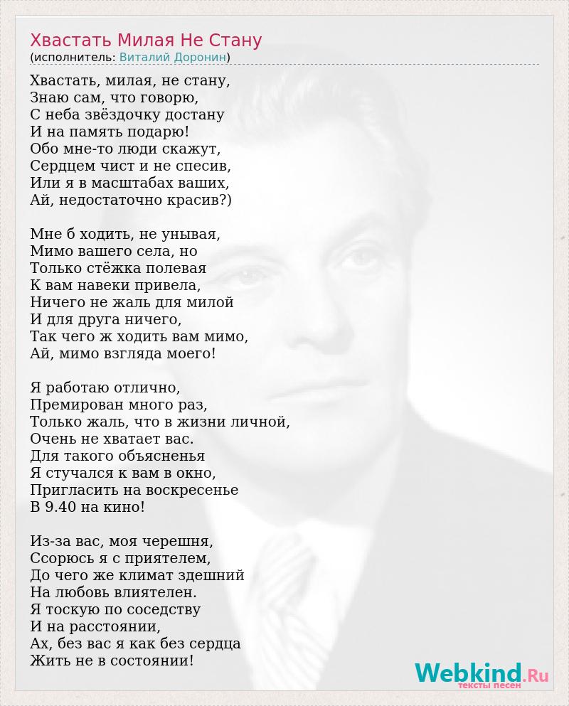 Хвастать, милая, не стану, Знаю сам, что говорю, С неба звёздочку достану И на память подарю! Обо мне-то люди скажут, Сердцем чист и не спесив, Или я в масштабах ваших, Ай, недостаточно красив?) Мне б ходить, не унывая, Мимо вашего села, но Только стёжка полевая К вам навеки привела, Ничего не жаль для милой И для друга ничего, Так чего ж ходить вам мимо, Ай, мимо взгляда моего! Я работаю отлично, Премирован много раз, Только жаль, что в жизни личной, Очень не хватает вас. Для такого объясненья Я стучался к вам в окно, Пригласить на воскресенье В 9.40 на кино! Из-за вас, моя черешня, Ссорюсь я с приятелем, До чего же климат здешний На любовь влиятелен. Я тоскую по соседству И на расстоянии, Ах, без вас я как без сердца Жить не в состоянии!