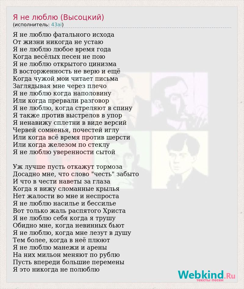Я не люблю фатального исхода От жизни никогда не устаю Я не люблю любое время года Когда весёлых песен не пою Я не люблю открытого цинизма В восторженность не верю и ещё Когда чужой мои читает письма Заглядывая мне через плечо Я не люблю когда наполовину Или когда прервали разговор Я не люблю, когда стреляют в спину Я также против выстрелов в упор Я ненавижу сплетни в виде версий Червей сомненья, почестей иглу Или когда всё время против шерсти Или когда железом по стеклу Я не люблю уверенности сытой Уж лучше пусть откажут тормоза Досадно мне, что слово "честь" забыто И что в чести наветы за глаза Когда я вижу сломанные крылья Нет жалости во мне и неспроста Я не люблю насилье и бессилье Вот только жаль распятого Христа Я не люблю себя когда я трушу Обидно мне, когда невинных бьют Я не люблю, когда мне лезут в душу Тем более, когда в неё плюют Я не люблю манежи и арены На них мильон меняют по рублю Пусть впереди большие перемены Я это никогда не полюблю