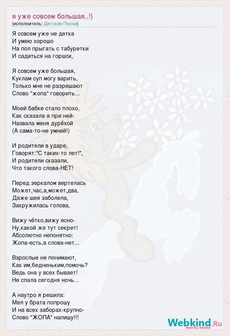 Я совсем уже не детка И умею хорошо На пол прыгать с табуретки И садиться на горшок, Я совсем уже большая, Куклам суп могу варить, Только мне не разрешают Слово "жопа" говорить... Моей бабке стало плохо, Как сказала я при ней- Назвала меня дурёхой (А сама-то-не умней!) И родители в ударе, Говорят:"С таких-то лет!", И родители сказали, Что такого слова-НЕТ! Перед зеркалом вертелась Может,час,а,может,два, Даже шея заболела, Закружилась голова, Вижу чётко,вижу ясно- Ну,какой же тут секрет! Абсолютно непонятно: Жопа-есть,а слова-нет... Взрослые не понимают, Как им,бедненьким,помочь? Ведь она у всех бывает! Не спала сегодня ночь... А наутро я решила: Мел у брата попрошу И на всех заборах-крупно- Слово "ЖОПА" напишу!!!