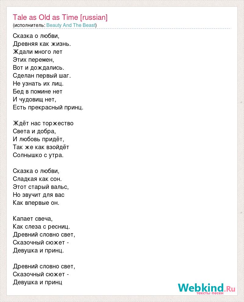 Сказка о любви, Древняя как жизнь. Ждали много лет Этих перемен, Вот и дождались. Сделан первый шаг. Не узнать их лиц. Бед в помине нет И чудовищ нет, Есть прекрасный принц. Ждёт нас торжество Света и добра, И любовь придёт, Так же как взойдёт Солнышко с утра. Сказка о любви, Сладкая как сон. Этот старый вальс, Но звучит для вас Как впервые он. Капает свеча, Как слеза с ресниц. Древний словно свет, Сказочный сюжет - Девушка и принц. Древний словно свет, Сказочный сюжет - Девушка и принц