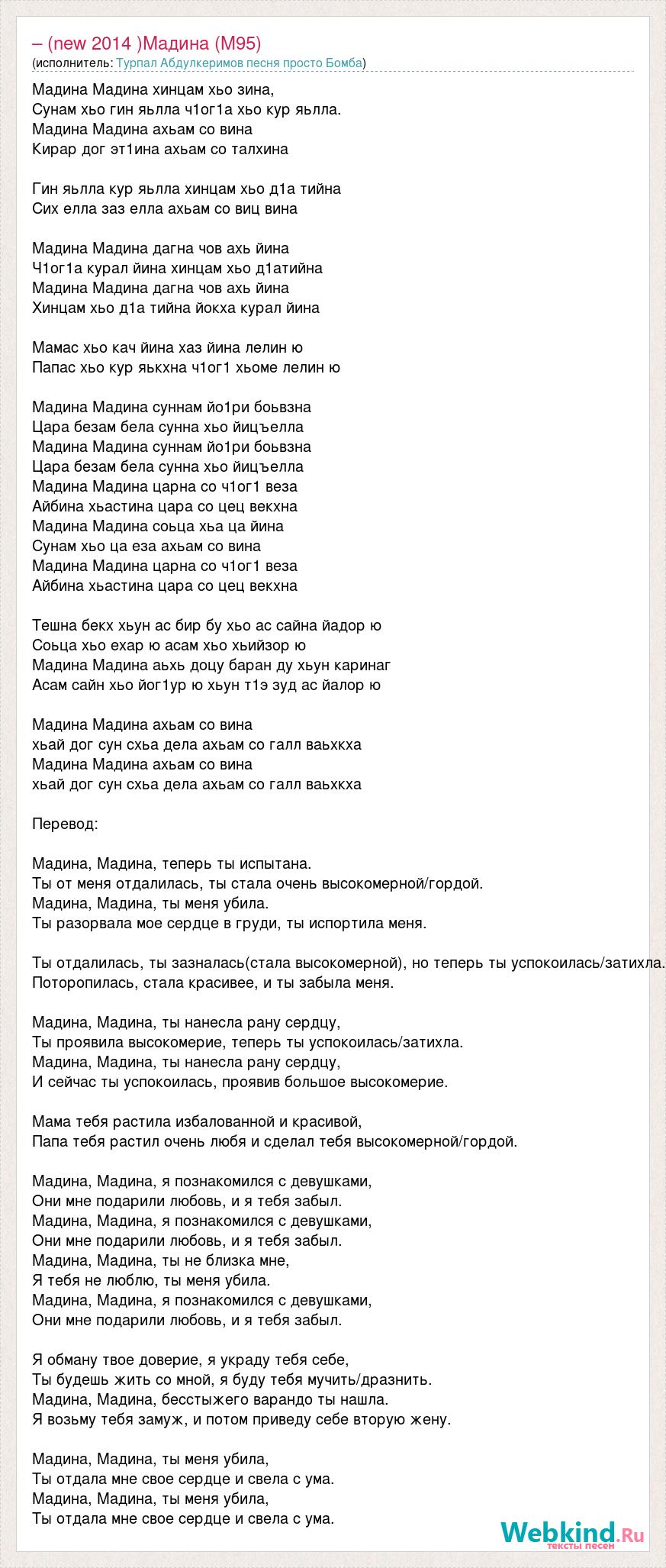 Мадина Мадина хинцам хьо зина, Сунам хьо гин яьлла ч1ог1а хьо кур яьлла. Мадина Мадина ахьам со вина Кирар дог эт1ина ахьам со талхина Гин яьлла кур яьлла хинцам хьо д1а тийна Сих елла заз елла ахьам со виц вина Мадина Мадина дагна чов ахь йина Ч1ог1а курал йина хинцам хьо д1атийна Мадина Мадина дагна чов ахь йина Хинцам хьо д1а тийна йокха курал йина Мамас хьо кач йина хаз йина лелин ю Папас хьо кур яькхна ч1ог1 хьоме лелин ю Мадина Мадина суннам йо1ри боьвзна Цара безам бела сунна хьо йицъелла Мадина Мадина суннам йо1ри боьвзна Цара безам бела сунна хьо йицъелла Мадина Мадина царна со ч1ог1 веза Айбина хьастина цара со цец векхна Мадина Мадина соьца хьа ца йина Сунам хьо ца еза ахьам со вина Мадина Мадина царна со ч1ог1 веза Айбина хьастина цара со цец векхна Тешна бекх хьун ас бир бу хьо ас сайна йадор ю Соьца хьо ехар ю асам хьо хьийзор ю Мадина Мадина аьхь доцу баран ду хьун каринаг Асам сайн хьо йог1ур ю хьун т1э зуд ас йалор ю Мадина Мадина ахьам со вина хьай дог сун схьа дела ахьам со галл ваьхкха Мадина Мадина ахьам со вина хьай дог сун схьа дела ахьам со галл ваьхкха Перевод: Мадина, Мадина, теперь ты испытана. Ты от меня отдалилась, ты стала очень высокомерной/гордой. Мадина, Мадина, ты меня убила. Ты разорвала мое сердце в груди, ты испортила меня. Ты отдалилась, ты зазналась(стала высокомерной), но теперь ты успокоилась/затихла. Поторопилась, стала красивее, и ты забыла меня. Мадина, Мадина, ты нанесла рану сердцу, Ты проявила высокомерие, теперь ты успокоилась/затихла. Мадина, Мадина, ты нанесла рану сердцу, И сейчас ты успокоилась, проявив большое высокомерие. Мама тебя растила избалованной и красивой, Папа тебя растил очень любя и сделал тебя высокомерной/гордой. Мадина, Мадина, я познакомился с девушками, Они мне подарили любовь, и я тебя забыл. Мадина, Мадина, я познакомился с девушками, Они мне подарили любовь, и я тебя забыл. Мадина, Мадина, ты не близка мне, Я тебя не люблю, ты меня убила. Мадина, Мадина, я познакомился с девушками, Они мне подарили любовь, и я тебя забыл. Я обману твое доверие, я украду тебя себе, Ты будешь жить со мной, я буду тебя мучить/дразнить. Мадина, Мадина, бесстыжего варандо ты нашла. Я возьму тебя замуж, и потом приведу себе вторую жену. Мадина, Мадина, ты меня убила, Ты отдала мне свое сердце и свела с ума. Мадина, Мадина, ты меня убила, Ты отдала мне свое сердце и свела с ума.
