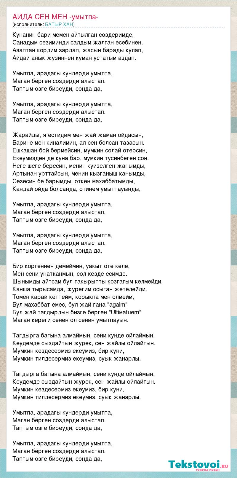 Кунанин бари мемен айтылган создеримде, Санадым сезиминди салдым жалган есебинен. Азаптан кордим зардап, жасын барады кулап, Айдай анык жузиннен куман устатым аздап. Умытпа, арадагы кундерди умытпа, Маган берген создерди алыстап. Таптым озге биреуди, сонда да, Умытпа, арадагы кундерди умытпа, Маган берген создерди алыстап. Таптым озге биреуди, сонда да, Жарайды, я естидим мен жай жаман ойдасын, Барине мен киналимин, ал сен болсан тазасын. Ешкашан бой бермейсин, мумкин солай отерсин, Екеумизден де куна бар, мумкин тусинбеген сон. Неге шеге бересин, менин куйзелген жанымды, Артынан урттайсын, менин кызганыш канымды, Сезесин бе барымды, откен махаббатымды, Кандай ойда болсанда, отинем умытпауынды, Умытпа, арадагы кундерди умытпа, Маган берген создерди алыстап. Таптым озге биреуди, сонда да, Умытпа, арадагы кундерди умытпа, Маган берген создерди алыстап. Таптым озге биреуди, сонда да, Бир коргеннен демеймин, уакыт оте келе, Мен сени унатканмын, сол кезде есимде. Шынымды айтсам бул такырыпты козгагым келмейди, Канша тырысамда, журегим осыган жетелейди. Томен карай кетпейм, корыкпа мен олмейм, Бул махаббат емес, бул жай гана "agaim" Бул жай тагдырдын бизге берген "Ultiмatuem" Маган кереги сенен ол сенин умытпауын. Тагдырга багына алмаймын, сени кунде ойлаймын, Кеудемде сыздайтын журек, сен жайлы ойлайтын. Мумкин кездесермиз екеумиз, бир куни, Мумкин тилдесермиз екеумиз, суык жанарлы. Тагдырга багына алмаймын, сени кунде ойлаймын, Кеудемде сыздайтын журек, сен жайлы ойлайтын. Мумкин кездесермиз екеумиз, бир куни, Мумкин тилдесермиз екеумиз, суык жанарлы. Умытпа, арадагы кундерди умытпа, Маган берген создерди алыстап. Таптым озге биреуди, сонда да, Умытпа, арадагы кундерди умытпа, Маган берген создерди алыстап. Таптым озге биреуди, сонда да,