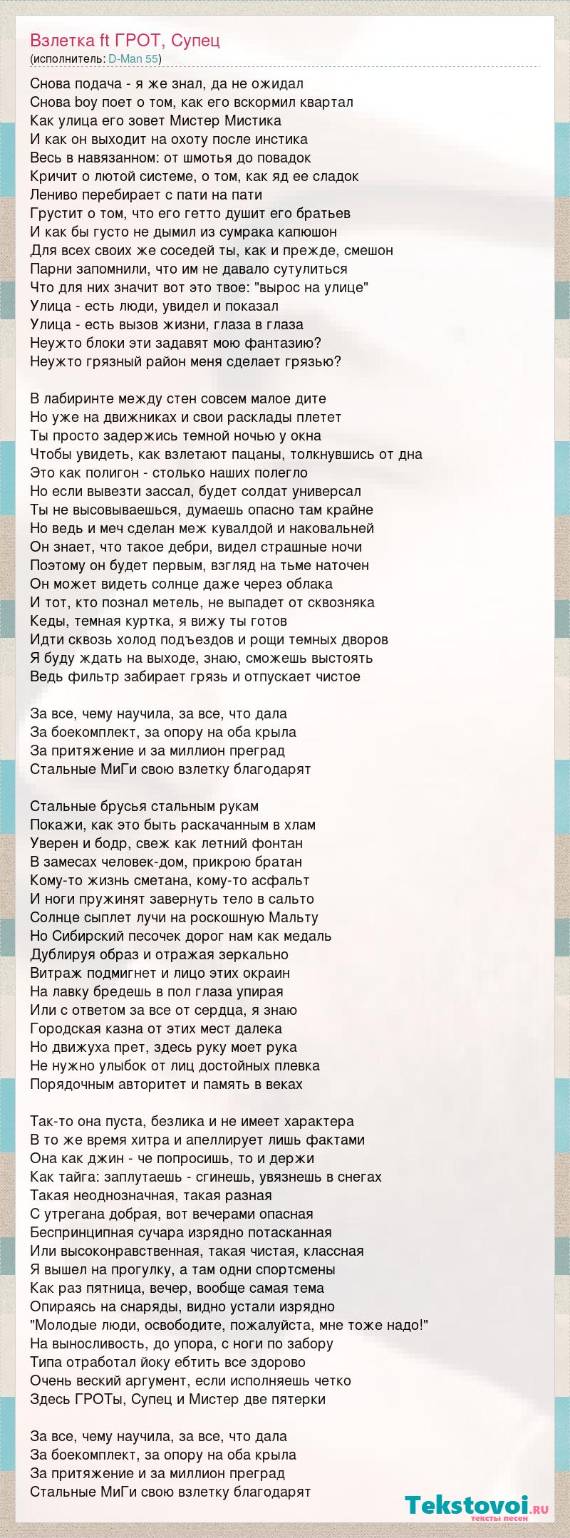 Снова подача - я же знал, да не ожидал Снова boy поет о том, как его вскормил квартал Как улица его зовет Мистер Мистика И как он выходит на охоту после инстика Весь в навязанном: от шмотья до повадок Кричит о лютой системе, о том, как яд ее сладок Лениво перебирает с пати на пати Грустит о том, что его гетто душит его братьев И как бы густо не дымил из сумрака капюшон Для всех своих же соседей ты, как и прежде, смешон Парни запомнили, что им не давало сутулиться Что для них значит вот это твое: "вырос на улице" Улица - есть люди, увидел и показал Улица - есть вызов жизни, глаза в глаза Неужто блоки эти задавят мою фантазию? Неужто грязный район меня сделает грязью? В лабиринте между стен совсем малое дите Но уже на движниках и свои расклады плетет Ты просто задержись темной ночью у окна Чтобы увидеть, как взлетают пацаны, толкнувшись от дна Это как полигон - столько наших полегло Но если вывезти зассал, будет солдат универсал Ты не высовываешься, думаешь опасно там крайне Но ведь и меч сделан меж кувалдой и наковальней Он знает, что такое дебри, видел страшные ночи Поэтому он будет первым, взгляд на тьме наточен Он может видеть солнце даже через облака И тот, кто познал метель, не выпадет от сквозняка Кеды, темная куртка, я вижу ты готов Идти сквозь холод подъездов и рощи темных дворов Я буду ждать на выходе, знаю, сможешь выстоять Ведь фильтр забирает грязь и отпускает чистое За все, чему научила, за все, что дала За боекомплект, за опору на оба крыла За притяжение и за миллион преград Стальные МиГи свою взлетку благодарят Стальные брусья стальным рукам Покажи, как это быть раскачанным в хлам Уверен и бодр, свеж как летний фонтан В замесах человек-дом, прикрою братан Кому-то жизнь сметана, кому-то асфальт И ноги пружинят завернуть тело в сальто Солнце сыплет лучи на роскошную Мальту Но Сибирский песочек дорог нам как медаль Дублируя образ и отражая зеркально Витраж подмигнет и лицо этих окраин На лавку бредешь в пол глаза упирая Или с ответом за все от сердца, я знаю Городская казна от этих мест далека Но движуха прет, здесь руку моет рука Не нужно улыбок от лиц достойных плевка Порядочным авторитет и память в веках Так-то она пуста, безлика и не имеет характера В то же время хитра и апеллирует лишь фактами Она как джин - че попросишь, то и держи Как тайга: заплутаешь - сгинешь, увязнешь в снегах Такая неоднозначная, такая разная С утрегана добрая, вот вечерами опасная Беспринципная сучара изрядно потасканная Или высоконравственная, такая чистая, классная Я вышел на прогулку, а там одни спортсмены Как раз пятница, вечер, вообще самая тема Опираясь на снаряды, видно устали изрядно "Молодые люди, освободите, пожалуйста, мне тоже надо!" На выносливость, до упора, с ноги по забору Типа отработал йоку ебтить все здорово Очень веский аргумент, если исполняешь четко Здесь ГРОТы, Супец и Мистер две пятерки За все, чему научила, за все, что дала За боекомплект, за опору на оба крыла За притяжение и за миллион преград Стальные МиГи свою взлетку благодарят