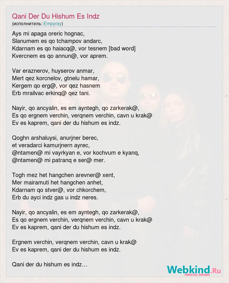 Ays mi apaga oreric hognac, Slanumem es qo tchampov andarc, Kdarnam es qo haiacq@, vor tesnem [bad word] Kvercnem es qo annun@, vor aprem. Var eraznerov, huyserov anmar, Mert qez korcnelov, gtnelu hamar, Kergem qo erg@, vor qez hasnem Erb mrailvac erkinq@ qez tani. Nayir, qo ancyalin, es em ayntegh, qo zarkerak@, Es qo ergnem verchin, verqnem verchin, cavn u krak@ Ev es kaprem, qani der du hishum es indz. Qoghn arshaluysi, anurjner berec, et veradarci kamurjnern ayrec, @ntamen@ mi vayrkyan e, vor kochvum e kyanq, @ntamen@ mi patranq e ser@ mer. Togh mez het hangchen arevner@ xent, Mer mairamuti het hangchen anhet, Kdarnam qo stver@, vor chkorchem, Erb du ayci indz gas u indz neres. Nayir, qo ancyalin, es em ayntegh, qo zarkerak@, Es qo ergnem verchin, verqnem verchin, cavn u krak@ Ev es kaprem, qani der du hishum es indz. Ergnem verchin, verqnem verchin, cavn u krak@ Ev es kaprem, qani der du hishum es indz. Qani der du hishum es indz…
