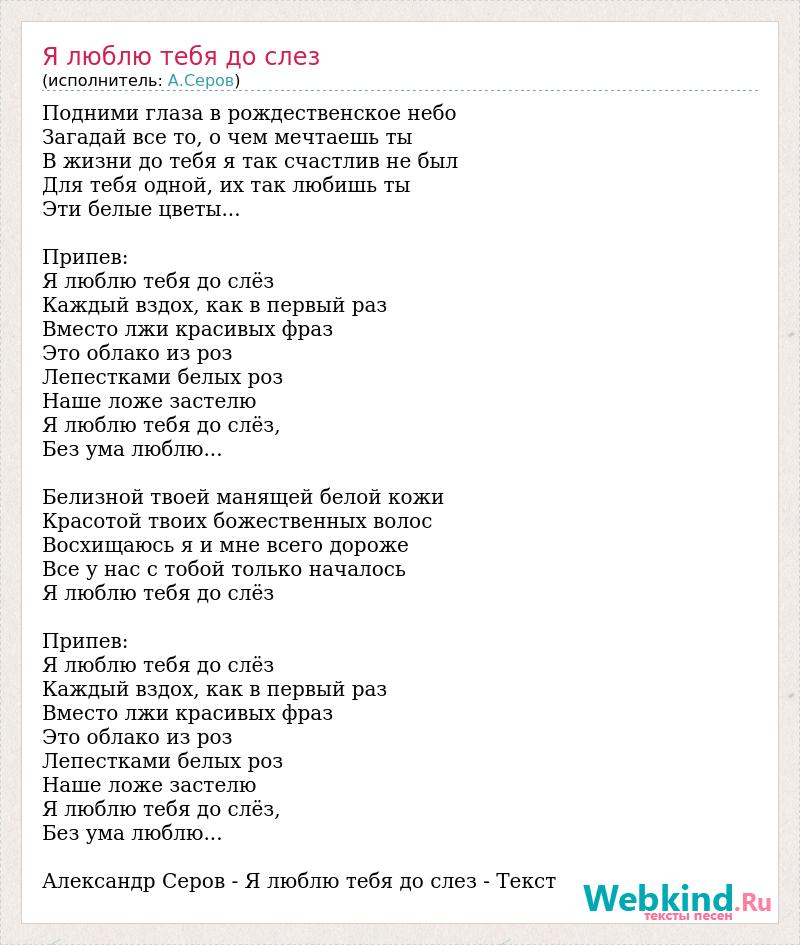 Подними глаза в рождественское небо Загадай все то, о чем мечтаешь ты В жизни до тебя я так счастлив не был Для тебя одной, их так любишь ты Эти белые цветы... Припев: Я люблю тебя до слёз Каждый вздох, как в первый раз Вместо лжи красивых фраз Это облако из роз Лепестками белых роз Наше ложе застелю Я люблю тебя до слёз, Без ума люблю... Белизной твоей манящей белой кожи Красотой твоих божественных волос Восхищаюсь я и мне всего дороже Все у нас с тобой только началось Я люблю тебя до слёз Припев: Я люблю тебя до слёз Каждый вздох, как в первый раз Вместо лжи красивых фраз Это облако из роз Лепестками белых роз Наше ложе застелю Я люблю тебя до слёз, Без ума люблю... Александр Серов - Я люблю тебя до слез - Текст