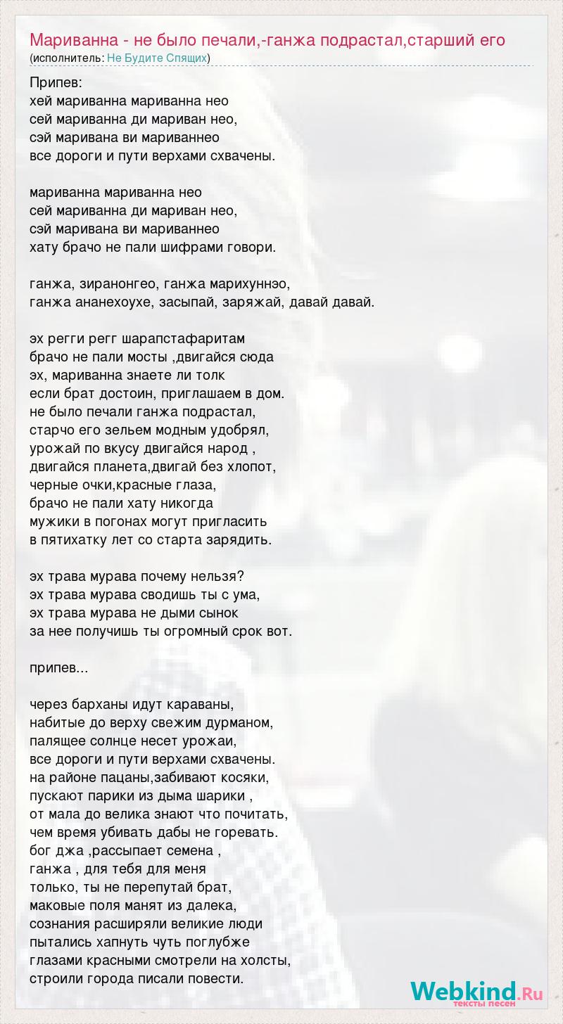 Припев: хей мариванна мариванна нео сей мариванна ди мариван нео, сэй маривана ви мариваннео все дороги и пути верхами схвачены. мариванна мариванна нео сей мариванна ди мариван нео, сэй маривана ви мариваннео хату брачо не пали шифрами говори. ганжа, зиранонгео, ганжа марихуннэо, ганжа ананехоухе, засыпай, заряжай, давай давай. эх регги регг шарапстафаритам брачо не пали мосты ,двигайся сюда эх, мариванна знаете ли толк если брат достоин, приглашаем в дом. не было печали ганжа подрастал, старчо его зельем модным удобрял, урожай по вкусу двигайся народ , двигайся планета,двигай без хлопот, черные очки,красные глаза, брачо не пали хату никогда мужики в погонах могут пригласить в пятихатку лет со старта зарядить. эх трава мурава почему нельзя? эх трава мурава сводишь ты с ума, эх трава мурава не дыми сынок за нее получишь ты огромный срок вот. припев... через барханы идут караваны, набитые до верху свежим дурманом, палящее солнце несет урожаи, все дороги и пути верхами схвачены. на районе пацаны,забивают косяки, пускают парики из дыма шарики , от мала до велика знают что почитать, чем время убивать дабы не горевать. бог джа ,рассыпает семена , ганжа , для тебя для меня только, ты не перепутай брат, маковые поля манят из далека, сознания расширяли великие люди пытались хапнуть чуть поглубже глазами красными смотрели на холсты, строили города писали повести.