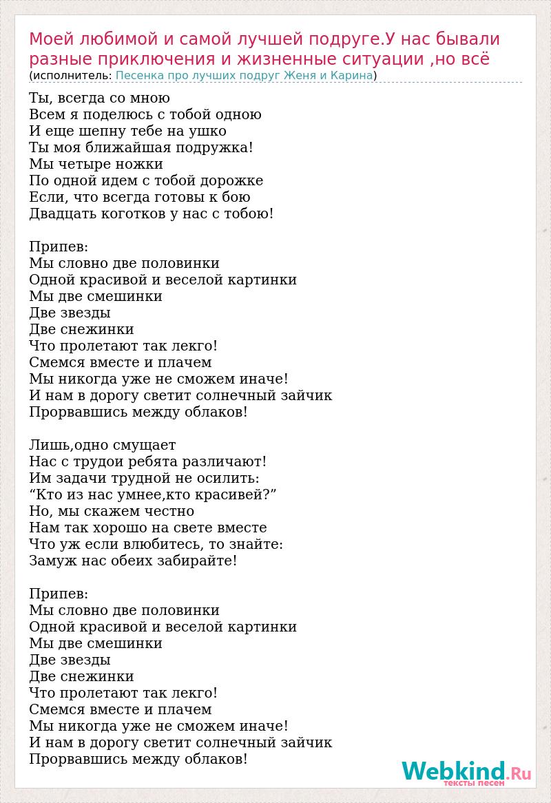Ты, всегда со мною Всем я поделюсь с тобой одною И еще шепну тебе на ушко Ты моя ближайшая подружка! Мы четыре ножки По одной идем с тобой дорожке Если, что всегда готовы к бою Двадцать коготков у нас с тобою! Припев: Мы словно две половинки Одной красивой и веселой картинки Мы две смешинки Две звезды Две снежинки Что пролетают так лекго! Смемся вместе и плачем Мы никогда уже не сможем иначе! И нам в дорогу светит солнечный зайчик Прорвавшись между облаков! Лишь,одно смущает Нас с трудои ребята различают! Им задачи трудной не осилить: “Кто из нас умнее,кто красивей?” Но, мы скажем честно Нам так хорошо на свете вместе Что уж если влюбитесь, то знайте: Замуж нас обеих забирайте! Припев: Мы словно две половинки Одной красивой и веселой картинки Мы две смешинки Две звезды Две снежинки Что пролетают так лекго! Смемся вместе и плачем Мы никогда уже не сможем иначе! И нам в дорогу светит солнечный зайчик Прорвавшись между облаков!