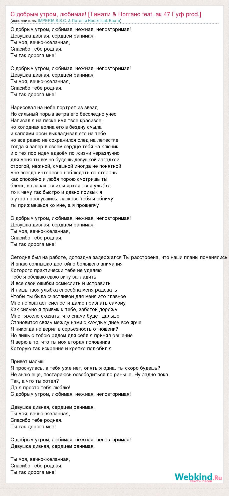 Главная→Исполнители→IMPERIA S.S.C. & Потап и Настя feat. Баста→С добрым утром, любимая! [Тимати & Ноггано feat. ак 47 Гуф prod.]