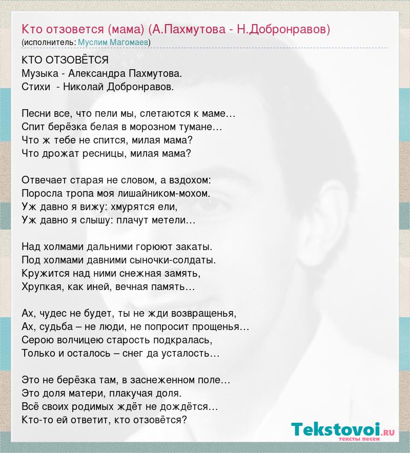 КТО ОТЗОВЁТСЯ Музыка - Александра Пахмутова. Стихи - Николай Добронравов. Песни все, что пели мы, слетаются к маме… Спит берёзка белая в морозном тумане… Что ж тебе не спится, милая мама? Что дрожат ресницы, милая мама? Отвечает старая не словом, а вздохом: Поросла тропа моя лишайником-мохом. Уж давно я вижу: хмурятся ели, Уж давно я слышу: плачут метели… Над холмами дальними горюют закаты. Под холмами давними сыночки-солдаты. Кружится над ними снежная замять, Хрупкая, как иней, вечная память… Ах, чудес не будет, ты не жди возвращенья, Ах, судьба – не люди, не попросит прощенья… Серою волчицею старость подкралась, Только и осталось – снег да усталость… Это не берёзка там, в заснеженном поле… Это доля матери, плакучая доля. Всё своих родимых ждёт не дождётся… Кто-то ей ответит, кто отзовётся?