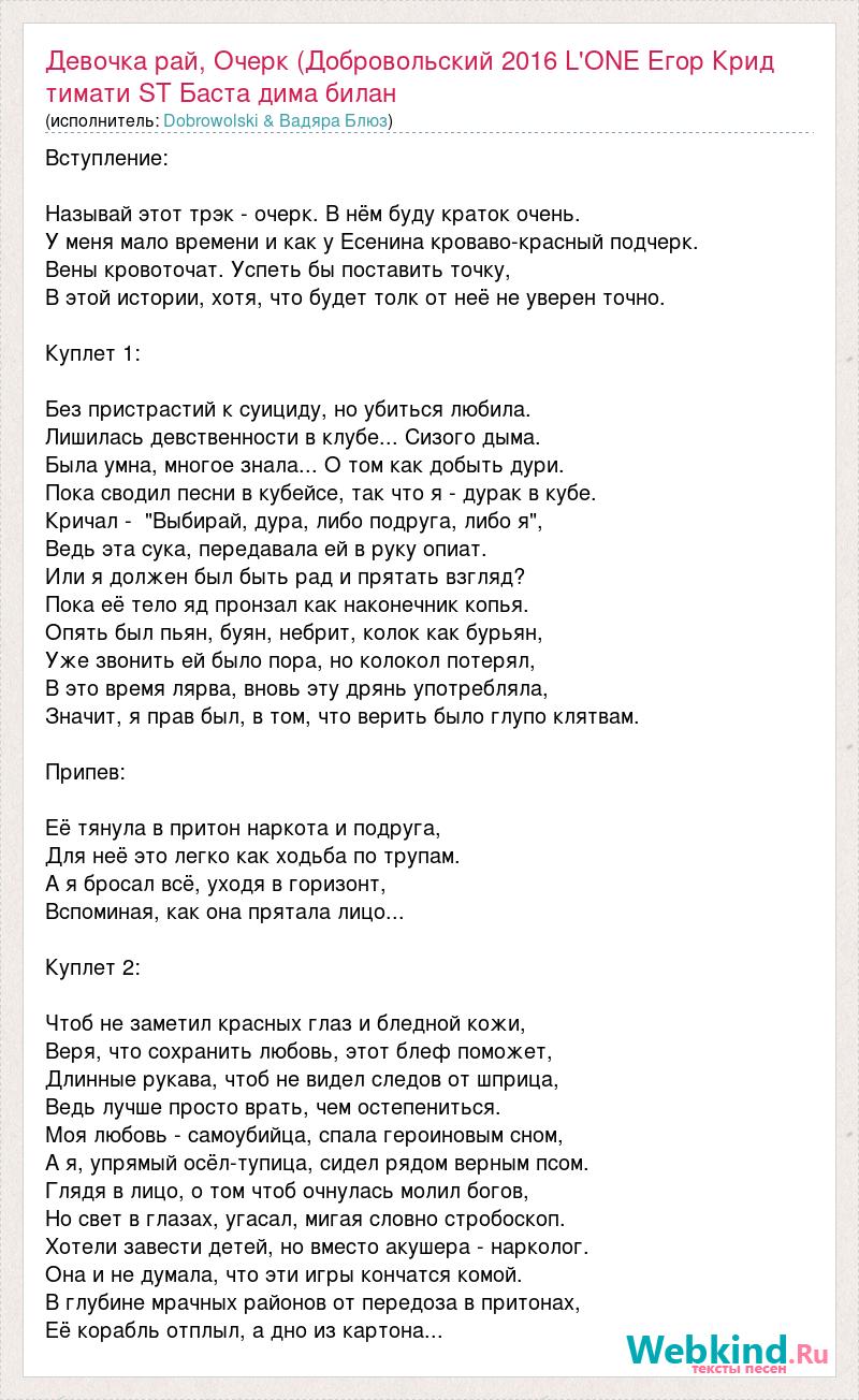 Главная→Исполнители→Dobrowolski & Вадяра Блюз→Девочка рай, Очерк (Добровольский 2016 L'ONE Егор Крид тимати ST Баста д