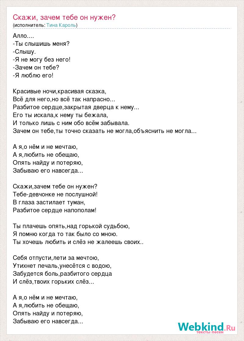 Алло.... -Ты слышишь меня? -Слышу. -Я не могу без него! -Зачем он тебе? -Я люблю его! Красивые ночи,красивая сказка, Всё для него,но всё так напрасно... Разбитое сердце,закрытая дверца к нему... Его ты искала,к нему ты бежала, И только лишь с ним обо всём забывала. Зачем он тебе,ты точно сказать не могла,объяснить не могла... А я,о нём и не мечтаю, А я,любить не обещаю, Опять найду и потеряю, Забываю его навсегда... Скажи,зачем тебе он нужен? Тебе-девчонке не послушной! В глаза застилает туман, Разбитое сердце напополам! Ты плачешь опять,над горькой судьбою, Я помню когда то так было со мною. Ты хочешь любить и слёз не жалеешь своих.. Себя отпусти,лети за мечтою, Утихнет печаль,унесётся с водою, Забудется боль,разбитого сердца И слёз,твоих горьких слёз... А я,о нём и не мечтаю, А я,любить не обещаю, Опять найду и потеряю, Забываю его навсегда...