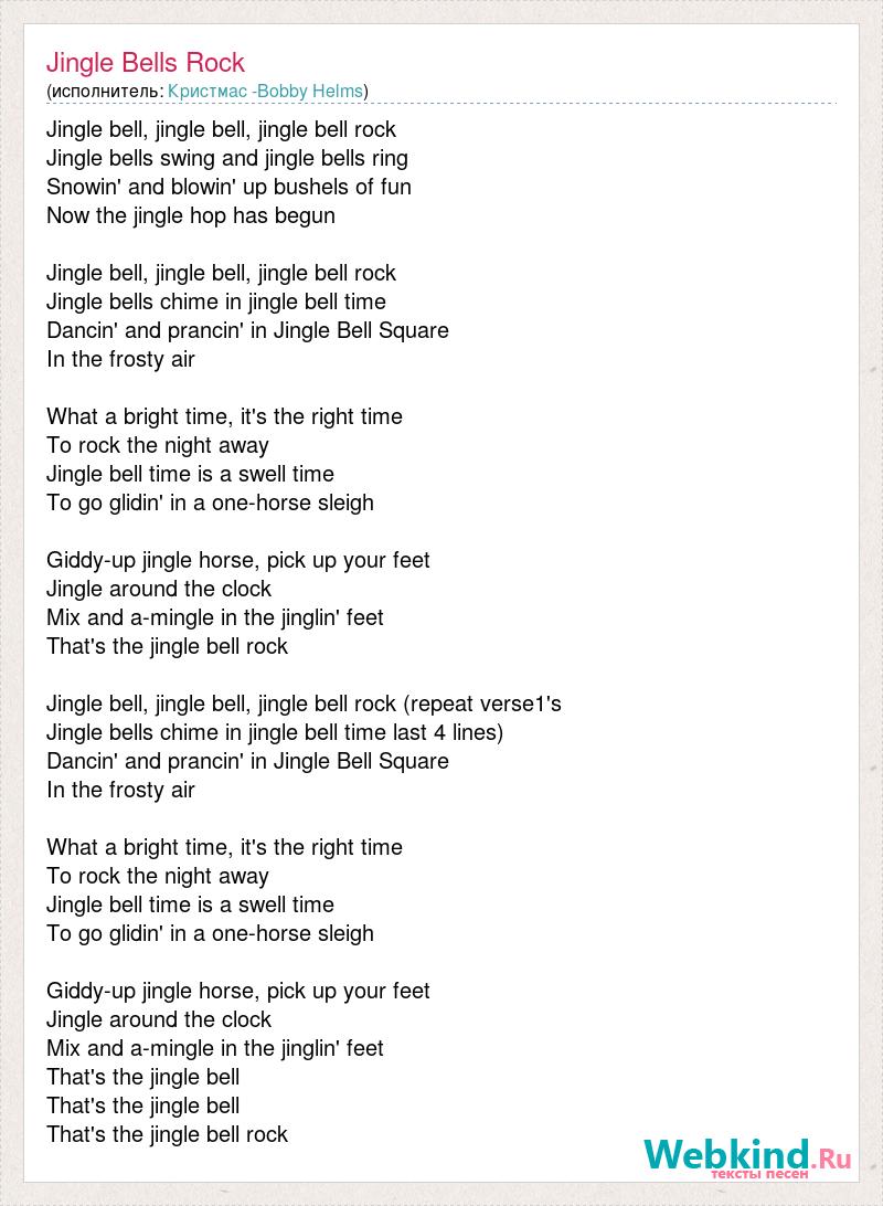 Jingle bell, jingle bell, jingle bell rock Jingle bells swing and jingle bells ring Snowin' and blowin' up bushels of fun Now the jingle hop has begun Jingle bell, jingle bell, jingle bell rock Jingle bells chime in jingle bell time Dancin' and prancin' in Jingle Bell Square In the frosty air What a bright time, it's the right time To rock the night away Jingle bell time is a swell time To go glidin' in a one-horse sleigh Giddy-up jingle horse, pick up your feet Jingle around the clock Mix and a-mingle in the jinglin' feet That's the jingle bell rock Jingle bell, jingle bell, jingle bell rock (repeat verse1's Jingle bells chime in jingle bell time last 4 lines) Dancin' and prancin' in Jingle Bell Square In the frosty air What a bright time, it's the right time To rock the night away Jingle bell time is a swell time To go glidin' in a one-horse sleigh Giddy-up jingle horse, pick up your feet Jingle around the clock Mix and a-mingle in the jinglin' feet That's the jingle bell That's the jingle bell That's the jingle bell rock
