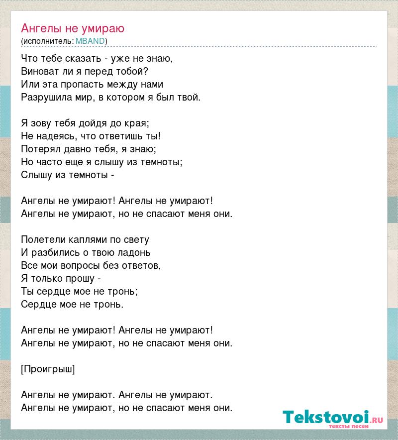 Что тебе сказать - уже не знаю, Виноват ли я перед тобой? Или эта пропасть между нами Разрушила мир, в котором я был твой. Я зову тебя дойдя до края; Не надеясь, что ответишь ты! Потерял давно тебя, я знаю; Но часто еще я слышу из темноты; Слышу из темноты - Ангелы не умирают! Ангелы не умирают! Ангелы не умирают, но не спасают меня они. Полетели каплями по свету И разбились о твою ладонь Все мои вопросы без ответов, Я только прошу - Ты сердце мое не тронь; Сердце мое не тронь. Ангелы не умирают! Ангелы не умирают! Ангелы не умирают, но не спасают меня они. [Проигрыш] Ангелы не умирают. Ангелы не умирают. Ангелы не умирают, но не спасают меня они.