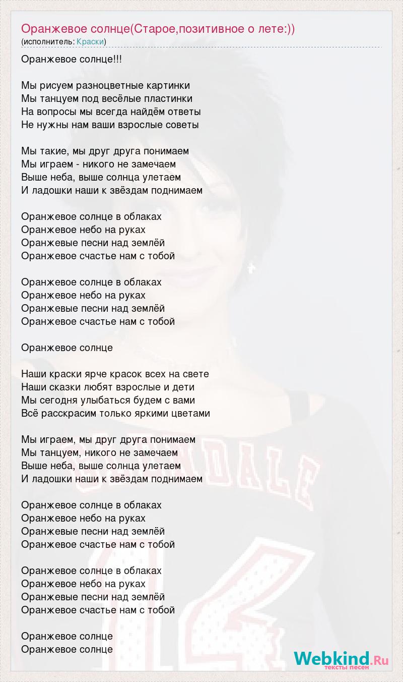 Оранжевое солнце!!! Мы рисуем разноцветные картинки Мы танцуем под весёлые пластинки На вопросы мы всегда найдём ответы Не нужны нам ваши взрослые советы Мы такие, мы друг друга понимаем Мы играем - никого не замечаем Выше неба, выше солнца улетаем И ладошки наши к звёздам поднимаем Оранжевое солнце в облаках Оранжевое небо на руках Оранжевые песни над землёй Оранжевое счастье нам с тобой Оранжевое солнце в облаках Оранжевое небо на руках Оранжевые песни над землёй Оранжевое счастье нам с тобой Оранжевое солнце Наши краски ярче красок всех на свете Наши сказки любят взрослые и дети Мы сегодня улыбаться будем с вами Всё расскрасим только яркими цветами Мы играем, мы друг друга понимаем Мы танцуем, никого не замечаем Выше неба, выше солнца улетаем И ладошки наши к звёздам поднимаем Оранжевое солнце в облаках Оранжевое небо на руках Оранжевые песни над землёй Оранжевое счастье нам с тобой Оранжевое солнце в облаках Оранжевое небо на руках Оранжевые песни над землёй Оранжевое счастье нам с тобой Оранжевое солнце Оранжевое солнце