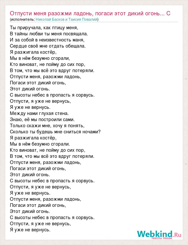 Ты приручала, как птицу меня, В тайны любви ты меня посвящала. И за собой в неизвестность маня, Сердце своё мне отдать обещала. Я разжигала костёр, Мы в нём безумно сгорали, Кто виноват, не пойму до сих пор, В том, что мы всё это вдруг потеряли. Отпусти меня, разожми ладонь, Погаси этот дикий огонь, Этот дикий огонь. С высоты небес в пропасть я сорвусь. Отпусти, я уже не вернусь, Я уже не вернусь. Между нами глухая стена. Знаю, её мы построили сами. Только скажи мне, хочу я понять, Сколько ты будешь мне сниться ночами? Я разжигала костёр, Мы в нём безумно сгорали. Кто виноват, не пойму до сих пор, В том, что мы всё это вдруг потеряли. Отпусти меня, разожми ладонь, Погаси этот дикий огонь, Этот дикий огонь. С высоты небес в пропасть я сорвусь. Отпусти, я уже не вернусь, Я уже не вернусь. Отпусти меня, разожми ладонь, Погаси этот дикий огонь, Этот дикий огонь. С высоты небес в пропасть я сорвусь. Отпусти, я уже не вернусь, Я уже не вернусь.