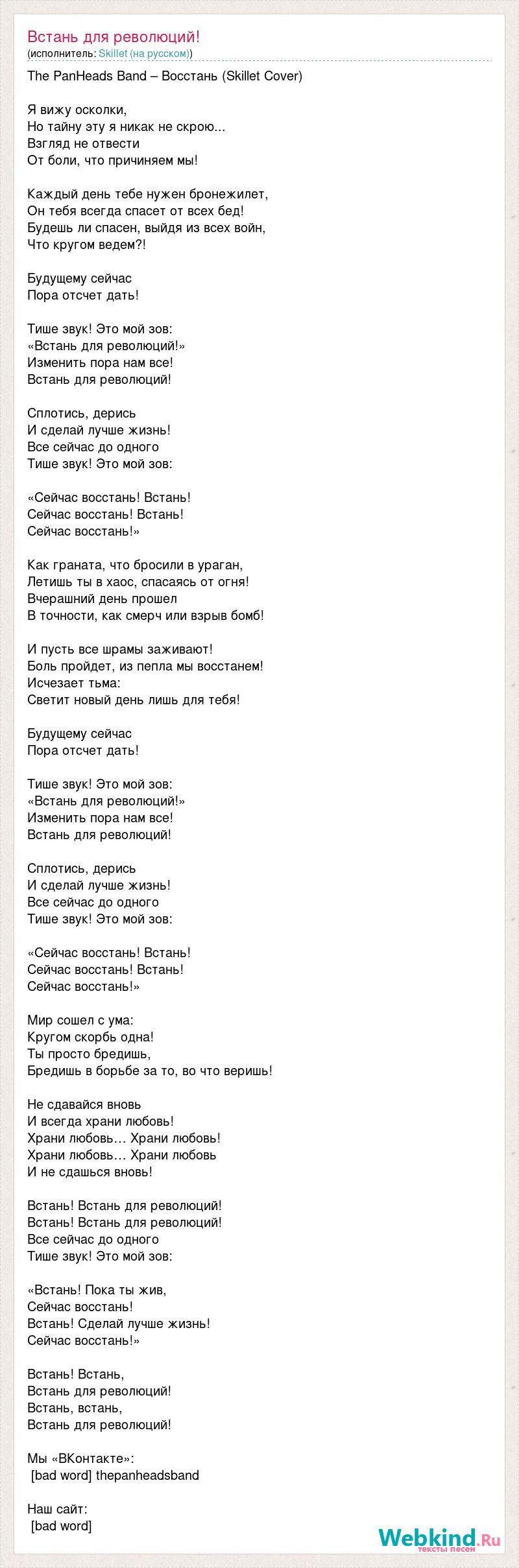 The PanHeads Band – Восстань (Skillet Cover) Я вижу осколки, Но тайну эту я никак не скрою... Взгляд не отвести От боли, что причиняем мы! Каждый день тебе нужен бронежилет, Он тебя всегда спасет от всех бед! Будешь ли спасен, выйдя из всех войн, Что кругом ведем?! Будущему сейчас Пора отсчет дать! Тише звук! Это мой зов: «Встань для революций!» Изменить пора нам все! Встань для революций! Сплотись, дерись И сделай лучше жизнь! Все сейчас до одного Тише звук! Это мой зов: «Сейчас восстань! Встань! Сейчас восстань! Встань! Сейчас восстань!» Как граната, что бросили в ураган, Летишь ты в хаос, спасаясь от огня! Вчерашний день прошел В точности, как смерч или взрыв бомб! И пусть все шрамы заживают! Боль пройдет, из пепла мы восстанем! Исчезает тьма: Светит новый день лишь для тебя! Будущему сейчас Пора отсчет дать! Тише звук! Это мой зов: «Встань для революций!» Изменить пора нам все! Встань для революций! Сплотись, дерись И сделай лучше жизнь! Все сейчас до одного Тише звук! Это мой зов: «Сейчас восстань! Встань! Сейчас восстань! Встань! Сейчас восстань!» Мир сошел с ума: Кругом скорбь одна! Ты просто бредишь, Бредишь в борьбе за то, во что веришь! Не сдавайся вновь И всегда храни любовь! Храни любовь… Храни любовь! Храни любовь… Храни любовь И не сдашься вновь! Встань! Встань для революций! Встань! Встань для революций! Все сейчас до одного Тише звук! Это мой зов: «Встань! Пока ты жив, Сейчас восстань! Встань! Сделай лучше жизнь! Сейчас восстань!» Встань! Встань, Встань для революций! Встань, встань, Встань для революций! Мы «ВКонтакте»: [bad word] thepanheadsband Наш сайт: [bad word]