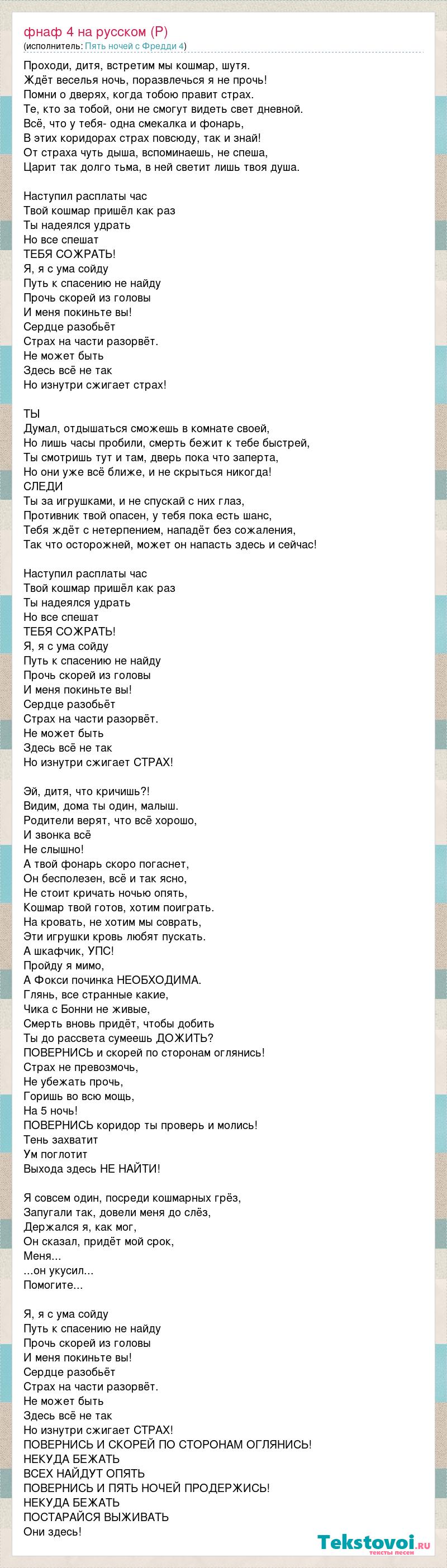 Проходи, дитя, встретим мы кошмар, шутя. Ждёт веселья ночь, поразвлечься я не прочь! Помни о дверях, когда тобою правит страх. Те, кто за тобой, они не смогут видеть свет дневной. Всё, что у тебя- одна смекалка и фонарь, В этих коридорах страх повсюду, так и знай! От страха чуть дыша, вспоминаешь, не спеша, Царит так долго тьма, в ней светит лишь твоя душа. Наступил расплаты час Твой кошмар пришёл как раз Ты надеялся удрать Но все спешат ТЕБЯ СОЖРАТЬ! Я, я с ума сойду Путь к спасению не найду Прочь скорей из головы И меня покиньте вы! Сердце разобьёт Страх на части разорвёт. Не может быть Здесь всё не так Но изнутри сжигает страх! ТЫ Думал, отдышаться сможешь в комнате своей, Но лишь часы пробили, смерть бежит к тебе быстрей, Ты смотришь тут и там, дверь пока что заперта, Но они уже всё ближе, и не скрыться никогда! СЛЕДИ Ты за игрушками, и не спускай с них глаз, Противник твой опасен, у тебя пока есть шанс, Тебя ждёт с нетерпением, нападёт без сожаления, Так что осторожней, может он напасть здесь и сейчас! Наступил расплаты час Твой кошмар пришёл как раз Ты надеялся удрать Но все спешат ТЕБЯ СОЖРАТЬ! Я, я с ума сойду Путь к спасению не найду Прочь скорей из головы И меня покиньте вы! Сердце разобьёт Страх на части разорвёт. Не может быть Здесь всё не так Но изнутри сжигает СТРАХ! Эй, дитя, что кричишь?! Видим, дома ты один, малыш. Родители верят, что всё хорошо, И звонка всё Не слышно! А твой фонарь скоро погаснет, Он бесполезен, всё и так ясно, Не стоит кричать ночью опять, Кошмар твой готов, хотим поиграть. На кровать, не хотим мы соврать, Эти игрушки кровь любят пускать. А шкафчик, УПС! Пройду я мимо, А Фокси починка НЕОБХОДИМА. Глянь, все странные какие, Чика с Бонни не живые, Смерть вновь придёт, чтобы добить Ты до рассвета сумеешь ДОЖИТЬ? ПОВЕРНИСЬ и скорей по сторонам оглянись! Страх не превозмочь, Не убежать прочь, Горишь во всю мощь, На 5 ночь! ПОВЕРНИСЬ коридор ты проверь и молись! Тень захватит Ум поглотит Выхода здесь НЕ НАЙТИ! Я совсем один, посреди кошмарных грёз, Запугали так, довели меня до слёз, Держался я, как мог, Он сказал, придёт мой срок, Меня... ...он укусил... Помогите... Я, я с ума сойду Путь к спасению не найду Прочь скорей из головы И меня покиньте вы! Сердце разобьёт Страх на части разорвёт. Не может быть Здесь всё не так Но изнутри сжигает СТРАХ! ПОВЕРНИСЬ И СКОРЕЙ ПО СТОРОНАМ ОГЛЯНИСЬ! НЕКУДА БЕЖАТЬ ВСЕХ НАЙДУТ ОПЯТЬ ПОВЕРНИСЬ И ПЯТЬ НОЧЕЙ ПРОДЕРЖИСЬ! НЕКУДА БЕЖАТЬ ПОСТАРАЙСЯ ВЫЖИВАТЬ Они здесь!