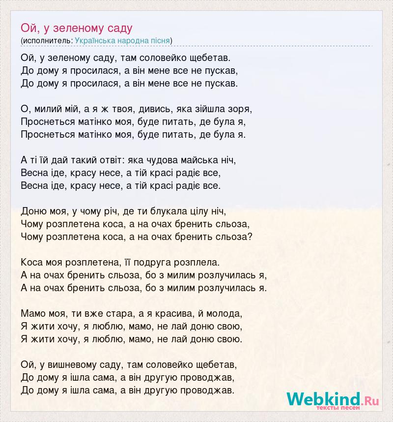 Ой, у зеленому саду, там соловейко щебетав. До дому я просилася, а він мене все не пускав, До дому я просилася, а він мене все не пускав. О, милий мій, а я ж твоя, дивись, яка зійшла зоря, Проснеться матінко моя, буде питать, де була я, Проснеться матінко моя, буде питать, де була я. А ті їй дай такий отвіт: яка чудова майська ніч, Весна іде, красу несе, а тій красі радіє все, Весна іде, красу несе, а тій красі радіє все. Доню моя, у чому річ, де ти блукала цілу ніч, Чому розплетена коса, а на очах бренить сльоза, Чому розплетена коса, а на очах бренить сльоза? Коса моя розплетена, її подруга розплела. А на очах бренить сльоза, бо з милим розлучилась я, А на очах бренить сльоза, бо з милим розлучилась я. Мамо моя, ти вже стара, а я красива, й молода, Я жити хочу, я люблю, мамо, не лай доню свою, Я жити хочу, я люблю, мамо, не лай доню свою. Ой, у вишневому саду, там соловейко щебетав, До дому я ішла сама, а він другую проводжав, До дому я ішла сама, а він другую проводжав.