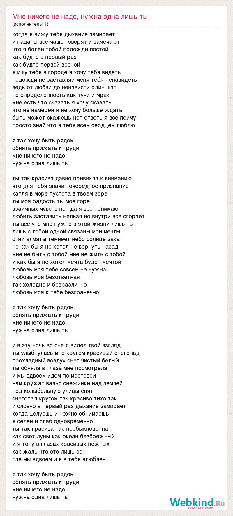 когда я вижу тебя дыхание замирает и пацаны все чаще говорят и замечают что я болен тобой подожди постой как будто в первый раз как будто первой весной я ищу тебя в городе я хочу тебя видеть подожди не заставляй меня тебя ненавидеть ведь от любви до ненависти один шаг не определенность как тучи и мрак мне есть что сказать я хочу сказать что не намерен и не хочу больше ждать быть может скажешь нет ответь я все пойму просто знай что я тебя всем сердцем люблю я так хочу быть рядом обнять прижать к груди мне ничего не надо нужна одна лишь ты ты так красива давно привикла к вниманию что для тебя значит очередное признание капля в море пустота в твоем зоре ты моя радость ты мое горе взаимных чувств нет да я все понимаю любить заставить нельзя но внутри все сгорает ты все что мне нужно в этой жизни лишь ты лишь с тобой одной связаны мои мечты огни алматы темнеет небо солнце закат но как бы я не хотел не вернуть назад мне не быть с тобой мне не жить с тобой и как бы я не хотел мечта будет мечтой любовь моя тебе совсем не нужна любовь моя безответная так холодно и безразлично любовь моя к тебе безгранечно я так хочу быть рядом обнять прижать к груди мне ничего не надо нужна одна лишь ты и в эту ночь во сне я видел твой взгляд ты улыбнулась мне кругом красивый снегопад прохладный воздух снег чистый белый ты обняла в глаза мне посмотрела и мы вдвоем идем по мостовой нам кружат вальс снежинки над землей под колыбельную улицы спят снегопад кругом так красиво тихо так и словно в первый раз дыхание замирает когда целуешь и нежно обнимаешь я селен и слаб одновременно ты так красива так необыкновенна как свет луны как океан безбрежный и я тону в глазах красивых нежных как жаль что это лишь сон где мы вдвоем и я в тебя влюблен я так хочу быть рядом обнять прижать к груди мне ничего не надо нужна одна лишь ты