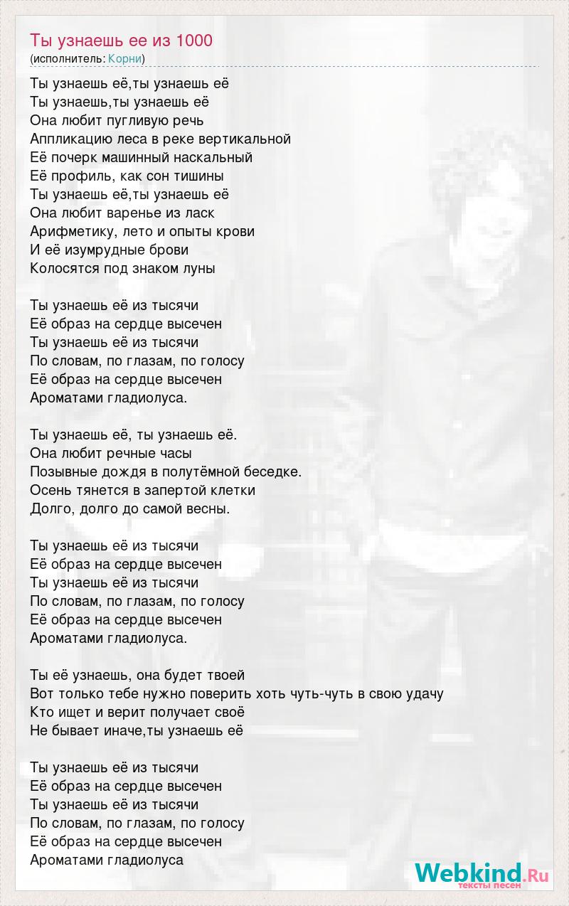 Ты узнаешь её,ты узнаешь её Ты узнаешь,ты узнаешь её Она любит пугливую речь Аппликацию леса в реке вертикальной Её почерк машинный наскальный Её профиль, как сон тишины Ты узнаешь её,ты узнаешь её Она любит варенье из ласк Арифметику, лето и опыты крови И её изумрудные брови Колосятся под знаком луны Ты узнаешь её из тысячи Её образ на сердце высечен Ты узнаешь её из тысячи По словам, по глазам, по голосу Её образ на сердце высечен Ароматами гладиолуса. Ты узнаешь её, ты узнаешь её. Она любит речные часы Позывные дождя в полутёмной беседке. Осень тянется в запертой клетки Долго, долго до самой весны. Ты узнаешь её из тысячи Её образ на сердце высечен Ты узнаешь её из тысячи По словам, по глазам, по голосу Её образ на сердце высечен Ароматами гладиолуса. Ты её узнаешь, она будет твоей Вот только тебе нужно поверить хоть чуть-чуть в свою удачу Кто ищет и верит получает своё Не бывает иначе,ты узнаешь её Ты узнаешь её из тысячи Её образ на сердце высечен Ты узнаешь её из тысячи По словам, по глазам, по голосу Её образ на сердце высечен Ароматами гладиолуса