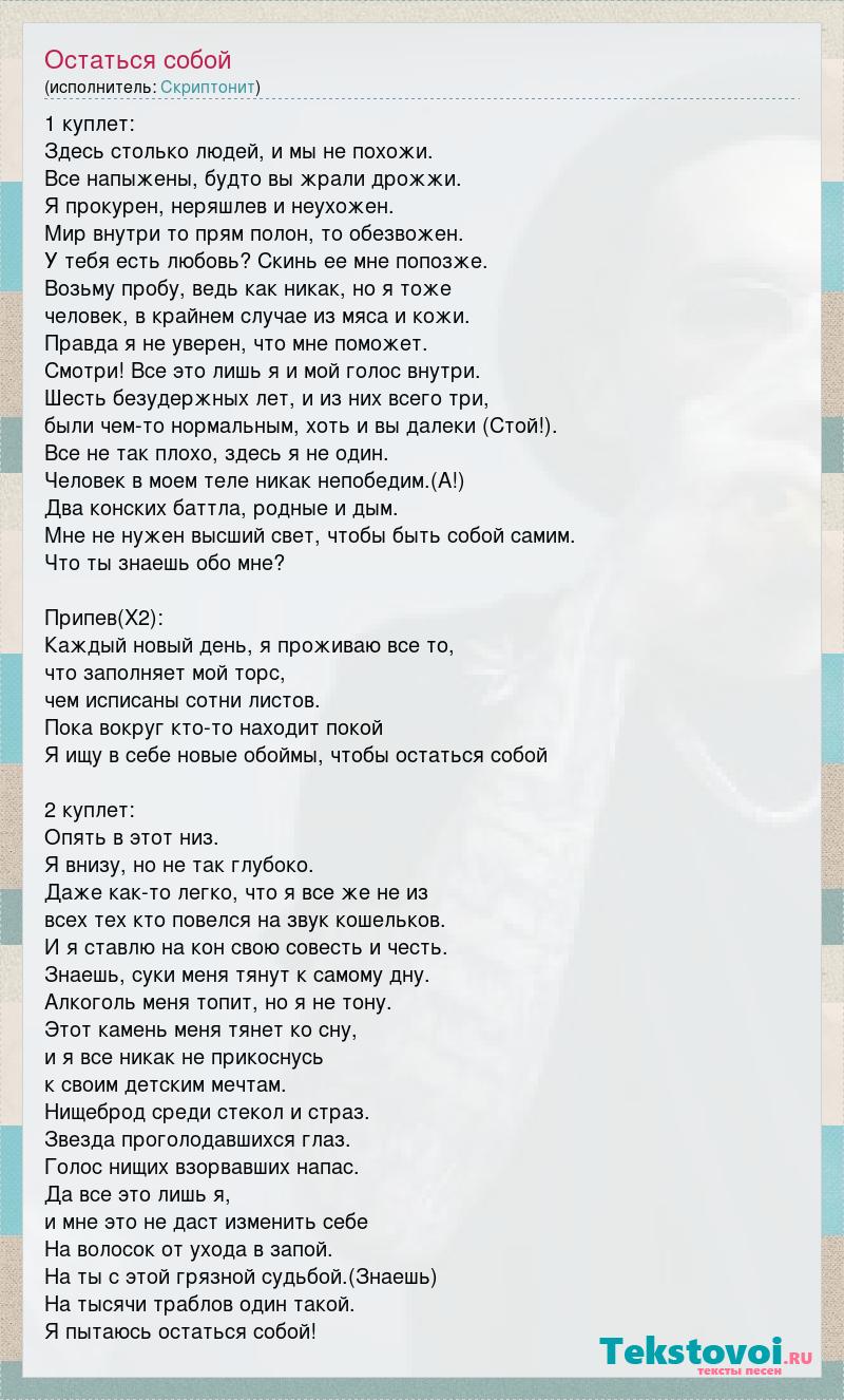 1 куплет: Здесь столько людей, и мы не похожи. Все напыжены, будто вы жрали дрожжи. Я прокурен, неряшлев и неухожен. Мир внутри то прям полон, то обезвожен. У тебя есть любовь? Скинь ее мне попозже. Возьму пробу, ведь как никак, но я тоже человек, в крайнем случае из мяса и кожи. Правда я не уверен, что мне поможет. Смотри! Все это лишь я и мой голос внутри. Шесть безудержных лет, и из них всего три, были чем-то нормальным, хоть и вы далеки (Стой!). Все не так плохо, здесь я не один. Человек в моем теле никак непобедим.(А!) Два конских баттла, родные и дым. Мне не нужен высший свет, чтобы быть собой самим. Что ты знаешь обо мне? Припев(Х2): Каждый новый день, я проживаю все то, что заполняет мой торс, чем исписаны сотни листов. Пока вокруг кто-то находит покой Я ищу в себе новые обоймы, чтобы остаться собой 2 куплет: Опять в этот низ. Я внизу, но не так глубоко. Даже как-то легко, что я все же не из всех тех кто повелся на звук кошельков. И я ставлю на кон свою совесть и честь. Знаешь, суки меня тянут к самому дну. Алкоголь меня топит, но я не тону. Этот камень меня тянет ко сну, и я все никак не прикоснусь к своим детским мечтам. Нищеброд среди стекол и страз. Звезда проголодавшихся глаз. Голос нищих взорвавших напас. Да все это лишь я, и мне это не даст изменить себе На волосок от ухода в запой. На ты с этой грязной судьбой.(Знаешь) На тысячи траблов один такой. Я пытаюсь остаться собой!