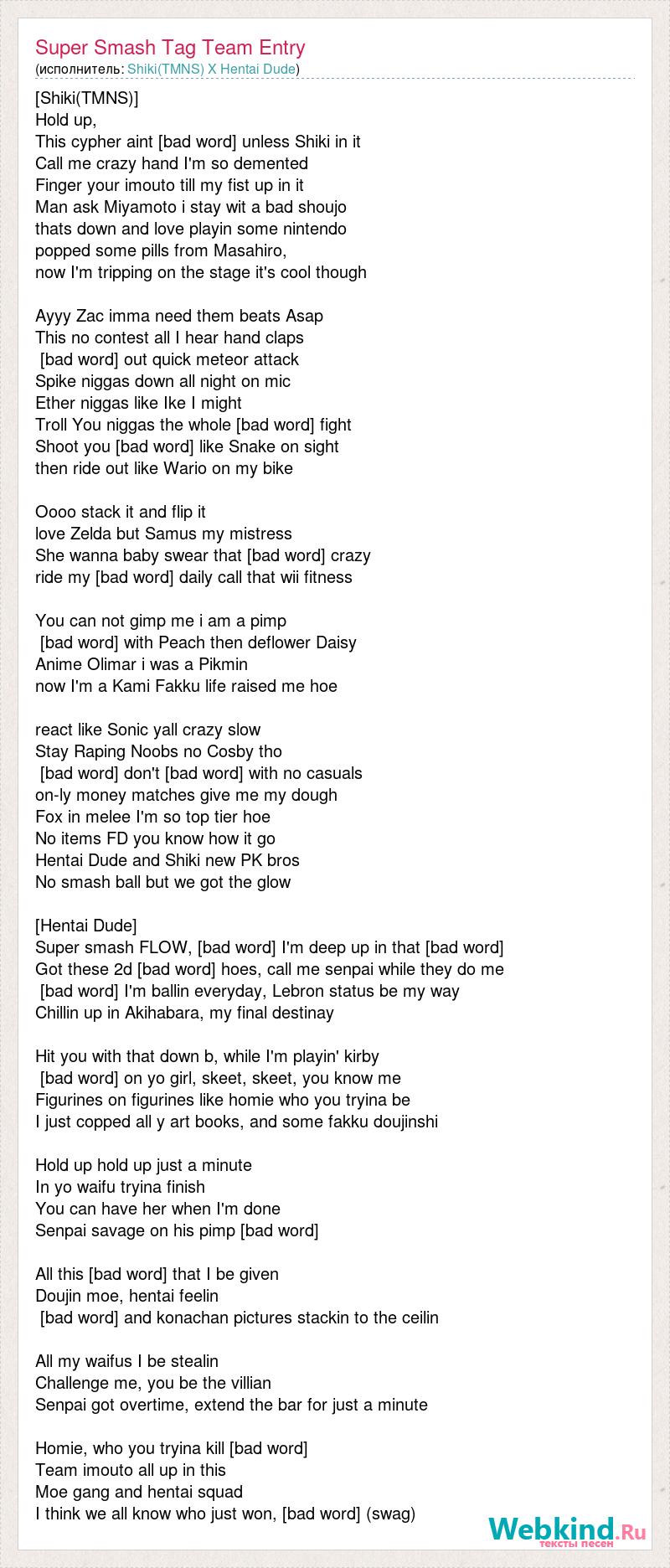 [Shiki(TMNS)] Hold up, This cypher aint [bad word] unless Shiki in it Call me crazy hand I'm so demented Finger your imouto till my fist up in it Man ask Miyamoto i stay wit a bad shoujo thats down and love playin some nintendo popped some pills from Masahiro, now I'm tripping on the stage it's cool though Ayyy Zac imma need them beats Asap This no contest all I hear hand claps [bad word] out quick meteor attack Spike niggas down all night on mic Ether niggas like Ike I might Troll You niggas the whole [bad word] fight Shoot you [bad word] like Snake on sight then ride out like Wario on my bike Oooo stack it and flip it love Zelda but Samus my mistress She wanna baby swear that [bad word] crazy ride my [bad word] daily call that wii fitness You can not gimp me i am a pimp [bad word] with Peach then deflower Daisy Anime Olimar i was a Pikmin now I'm a Kami Fakku life raised me hoe react like Sonic yall crazy slow Stay Raping Noobs no Cosby tho [bad word] don't [bad word] with no casuals on-ly money matches give me my dough Fox in melee I'm so top tier hoe No items FD you know how it go Hentai Dude and Shiki new PK bros No smash ball but we got the glow [Hentai Dude] Super smash FLOW, [bad word] I'm deep up in that [bad word] Got these 2d [bad word] hoes, call me senpai while they do me [bad word] I'm ballin everyday, Lebron status be my way Chillin up in Akihabara, my final destinay Hit you with that down b, while I'm playin' kirby [bad word] on yo girl, skeet, skeet, you know me Figurines on figurines like homie who you tryina be I just copped all y art books, and some fakku doujinshi Hold up hold up just a minute In yo waifu tryina finish You can have her when I'm done Senpai savage on his pimp [bad word] All this [bad word] that I be given Doujin moe, hentai feelin [bad word] and konachan pictures stackin to the ceilin All my waifus I be stealin Challenge me, you be the villian Senpai got overtime, extend the bar for just a minute Homie, who you tryina kill [bad word] Team imouto all up in this Moe gang and hentai squad I think we all know who just won, [bad word] (swag)