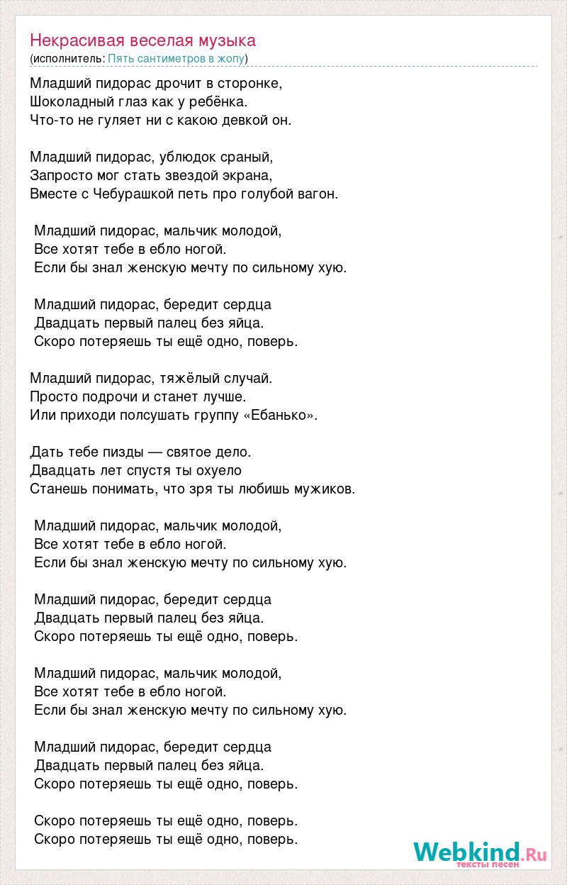 Младший пидорас дрочит в сторонке, Шоколадный глаз как у ребёнка. Что-то не гуляет ни с какою девкой он. Младший пидорас, ублюдок сраный, Запросто мог стать звездой экрана, Вместе с Чебурашкой петь про голубой вагон. Младший пидорас, мальчик молодой, Все хотят тебе в ебло ногой. Если бы знал женскую мечту по сильному хую. Младший пидорас, бередит сердца Двадцать первый палец без яйца. Скоро потеряешь ты ещё одно, поверь. Младший пидорас, тяжёлый случай. Просто подрочи и станет лучше. Или приходи полсушать группу «Ебанько». Дать тебе пизды — святое дело. Двадцать лет спустя ты охуело Станешь понимать, что зря ты любишь мужиков. Младший пидорас, мальчик молодой, Все хотят тебе в ебло ногой. Если бы знал женскую мечту по сильному хую. Младший пидорас, бередит сердца Двадцать первый палец без яйца. Скоро потеряешь ты ещё одно, поверь. Младший пидорас, мальчик молодой, Все хотят тебе в ебло ногой. Если бы знал женскую мечту по сильному хую. Младший пидорас, бередит сердца Двадцать первый палец без яйца. Скоро потеряешь ты ещё одно, поверь. Скоро потеряешь ты ещё одно, поверь. Скоро потеряешь ты ещё одно, поверь.