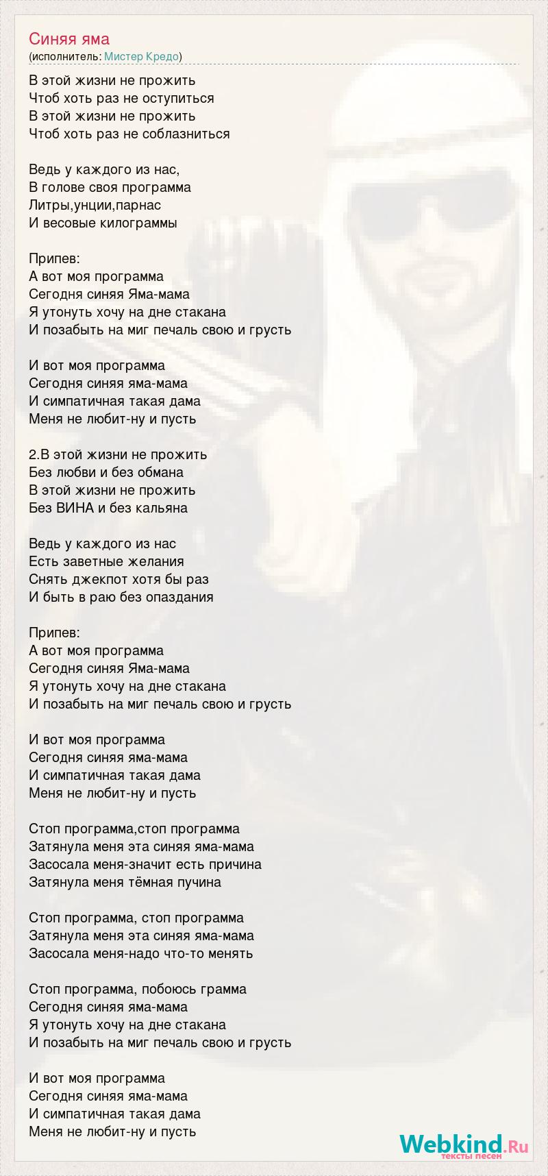 В этой жизни не прожить Чтоб хоть раз не оступиться В этой жизни не прожить Чтоб хоть раз не соблазниться Ведь у каждого из нас, В голове своя программа Литры,унции,парнас И весовые килограммы Припев: А вот моя программа Сегодня синяя Яма-мама Я утонуть хочу на дне стакана И позабыть на миг печаль свою и грусть И вот моя программа Сегодня синяя яма-мама И симпатичная такая дама Меня не любит-ну и пусть 2.В этой жизни не прожить Без любви и без обмана В этой жизни не прожить Без ВИНА и без кальяна Ведь у каждого из нас Есть заветные желания Снять джекпот хотя бы раз И быть в раю без опаздания Припев: А вот моя программа Сегодня синяя Яма-мама Я утонуть хочу на дне стакана И позабыть на миг печаль свою и грусть И вот моя программа Сегодня синяя яма-мама И симпатичная такая дама Меня не любит-ну и пусть Стоп программа,стоп программа Затянула меня эта синяя яма-мама Засосала меня-значит есть причина Затянула меня тёмная пучина Стоп программа, стоп программа Затянула меня эта синяя яма-мама Засосала меня-надо что-то менять Стоп программа, побоюсь грамма Сегодня синяя яма-мама Я утонуть хочу на дне стакана И позабыть на миг печаль свою и грусть И вот моя программа Сегодня синяя яма-мама И симпатичная такая дама Меня не любит-ну и пусть