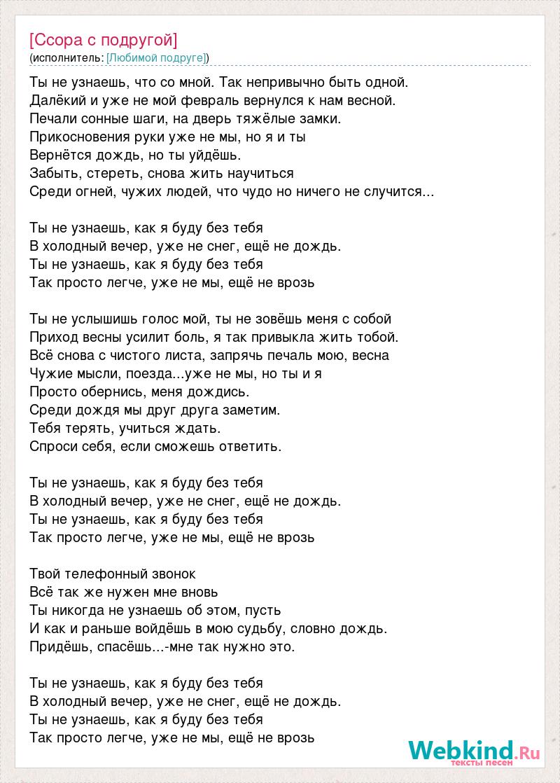 Ты не узнаешь, что со мной. Так непривычно быть одной. Далёкий и уже не мой февраль вернулся к нам весной. Печали сонные шаги, на дверь тяжёлые замки. Прикосновения руки уже не мы, но я и ты Вернётся дождь, но ты уйдёшь. Забыть, стереть, снова жить научиться Среди огней, чужих людей, что чудо но ничего не случится... Ты не узнаешь, как я буду без тебя В холодный вечер, уже не снег, ещё не дождь. Ты не узнаешь, как я буду без тебя Так просто легче, уже не мы, ещё не врозь Ты не услышишь голос мой, ты не зовёшь меня с собой Приход весны усилит боль, я так привыкла жить тобой. Всё снова с чистого листа, запрячь печаль мою, весна Чужие мысли, поезда...уже не мы, но ты и я Просто обернись, меня дождись. Среди дождя мы друг друга заметим. Тебя терять, учиться ждать. Спроси себя, если сможешь ответить. Ты не узнаешь, как я буду без тебя В холодный вечер, уже не снег, ещё не дождь. Ты не узнаешь, как я буду без тебя Так просто легче, уже не мы, ещё не врозь Твой телефонный звонок Всё так же нужен мне вновь Ты никогда не узнаешь об этом, пусть И как и раньше войдёшь в мою судьбу, словно дождь. Придёшь, спасёшь...-мне так нужно это. Ты не узнаешь, как я буду без тебя В холодный вечер, уже не снег, ещё не дождь. Ты не узнаешь, как я буду без тебя Так просто легче, уже не мы, ещё не врозь