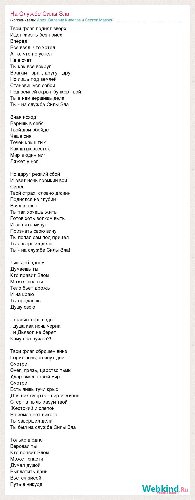 Твой флаг поднят вверх Идет жизнь без помех Вперед! Все взял, что хотел А то, что не успел Не в счет Ты как все вокруг Врагам - враг, другу - друг Но лишь под землей Становишься собой Под землей скрыт бункер твой Ты в нем вершишь дела Ты - на службе Силы Зла Зная исход Веришь в себя Твой дом обойдет Чаша сия Точен как штык Как штык жесток Мир в один миг Ляжет у ног! Но вдруг резкий сбой И рвет ночь громкий вой Сирен Твой страх, словно джинн Поднялся из глубин Взял в плен Ты так хочешь жить Готов хоть волком выть И за пять минут Признать свою вину Ты попал сам под прицел Ты завершил дела Ты - на службе Силы Зла! Лишь об одном Думаешь ты Кто правит Злом Может спасти Тело бьет дрожь И на краю Ты продаешь Душу свою . хозяин торг ведет . душа как ночь черна . и Дьявол не берет Кому она нужна?! Твой флаг сброшен вниз Горит ночь, стынут дни Смотри! Снег, грязь, царство тьмы Удар смял целый мир Смотри! Есть лишь тучи крыс Для них смерть - пир и жизнь Стерт в пыль разум твой Жестокий и слепой На земле нет никого Ты завершил дела Ты был на службе Силы Зла Только в одно Веровал ты Кто правит Злом Может спасти Думал душой Выплатить дань Вьется змеей Путь в никуда