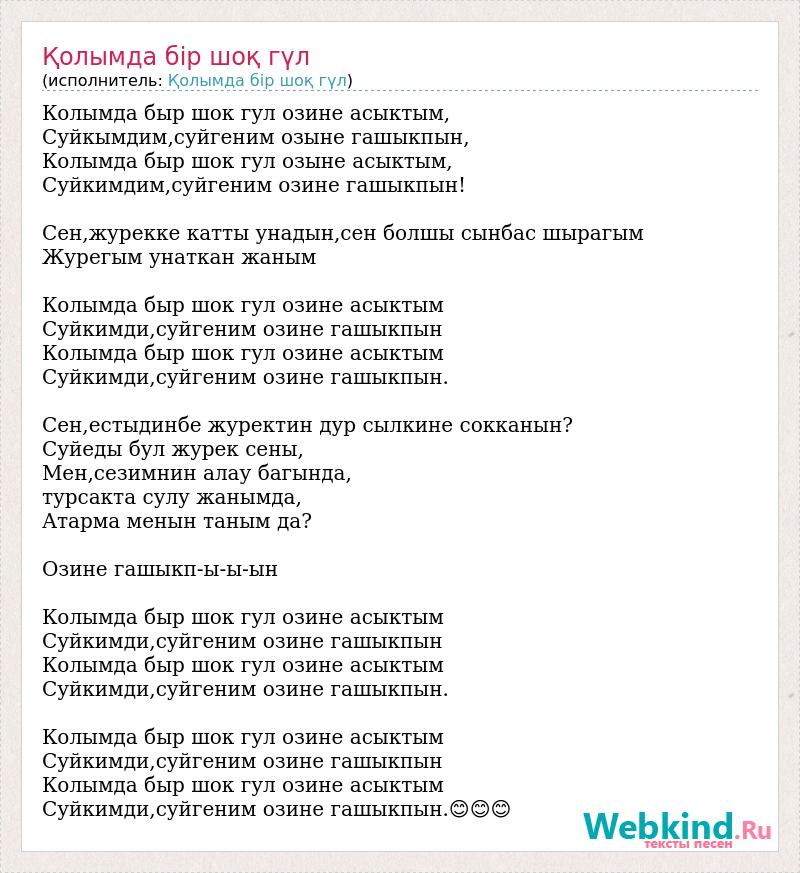 Колымда быр шок гул озине асыктым, Суйкымдим,суйгеним озыне гашыкпын, Колымда быр шок гул озыне асыктым, Суйкимдим,суйгеним озине гашыкпын! Сен,журекке катты унадын,сен болшы сынбас шырагым Журегым унаткан жаным Колымда быр шок гул озине асыктым Суйкимди,суйгеним озине гашыкпын Колымда быр шок гул озине асыктым Суйкимди,суйгеним озине гашыкпын. Сен,естыдинбе журектин дур сылкине сокканын? Суйеды бул журек сены, Мен,сезимнин алау багында, турсакта сулу жанымда, Атарма менын таным да? Озине гашыкп-ы-ы-ын Колымда быр шок гул озине асыктым Суйкимди,суйгеним озине гашыкпын Колымда быр шок гул озине асыктым Суйкимди,суйгеним озине гашыкпын. Колымда быр шок гул озине асыктым Суйкимди,суйгеним озине гашыкпын Колымда быр шок гул озине асыктым Суйкимди,суйгеним озине гашыкпын.😊😊😊💟