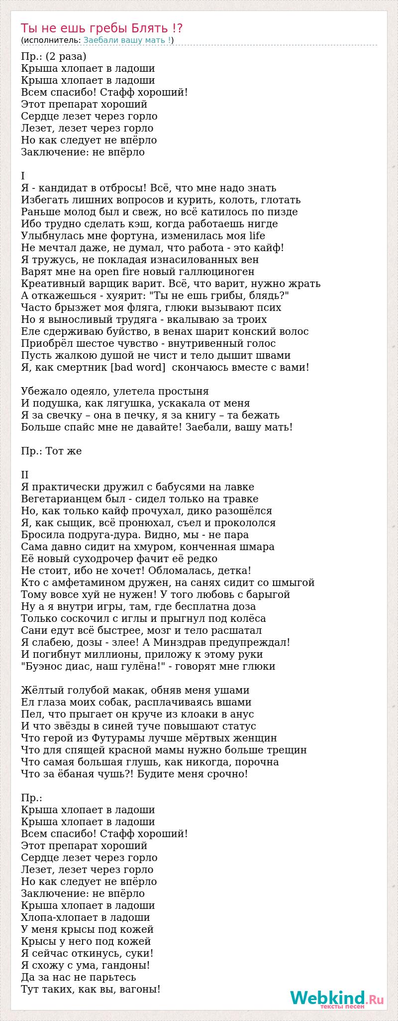 Пр.: (2 раза) Крыша хлопает в ладоши Крыша хлопает в ладоши Всем спасибо! Стафф хороший! Этот препарат хороший Сердце лезет через горло Лезет, лезет через горло Но как следует не впёрло Заключение: не впёрло I Я - кандидат в отбросы! Всё, что мне надо знать Избегать лишних вопросов и курить, колоть, глотать Раньше молод был и свеж, но всё катилось по пизде Ибо трудно сделать кэш, когда работаешь нигде Улыбнулась мне фортуна, изменилась моя life Не мечтал даже, не думал, что работа - это кайф! Я тружусь, не покладая изнасилованных вен Варят мне на open fire новый галлюциноген Креативный варщик варит. Всё, что варит, нужно жрать А откажешься - хуярит: "Ты не ешь грибы, блядь?" Часто брызжет моя фляга, глюки вызывают псих Но я выносливый трудяга - вкалываю за троих Еле сдерживаю буйство, в венах шарит конский волос Приобрёл шестое чувство - внутривенный голос Пусть жалкою душой не чист и тело дышит швами Я, как смертник [bad word] скончаюсь вместе с вами! Убежало одеяло, улетела простыня И подушка, как лягушка, ускакала от меня Я за свечку – она в печку, я за книгу – та бежать Больше спайс мне не давайте! Заебали, вашу мать! Пр.: Тот же II Я практически дружил с бабусями на лавке Вегетарианцем был - сидел только на травке Но, как только кайф прочухал, дико разошёлся Я, как сыщик, всё пронюхал, съел и прокололся Бросила подруга-дура. Видно, мы - не пара Сама давно сидит на хмуром, конченная шмара Её новый суходрочер фачит её редко Не стоит, ибо не хочет! Обломалась, детка! Кто с амфетамином дружен, на санях сидит со шмыгой Тому вовсе хуй не нужен! У того любовь с барыгой Ну а я внутри игры, там, где бесплатна доза Только соскочил с иглы и прыгнул под колёса Сани едут всё быстрее, мозг и тело расшатал Я слабею, дозы - злее! А Минздрав предупреждал! И погибнут миллионы, приложу к этому руки "Буэнос диас, наш гулёна!" - говорят мне глюки Жёлтый голубой макак, обняв меня ушами Ел глаза моих собак, расплачиваясь вшами Пел, что прыгает он круче из клоаки в анус И что звёзды в синей туче повышают статус Что герой из Футурамы лучше мёртвых женщин Что для спящей красной мамы нужно больше трещин Что самая большая глушь, как никогда, порочна Что за ёбаная чушь?! Будите меня срочно! Пр.: Крыша хлопает в ладоши Крыша хлопает в ладоши Всем спасибо! Стафф хороший! Этот препарат хороший Сердце лезет через горло Лезет, лезет через горло Но как следует не впёрло Заключение: не впёрло Крыша хлопает в ладоши Хлопа-хлопает в ладоши У меня крысы под кожей Крысы у него под кожей Я сейчас откинусь, суки! Я схожу с ума, гандоны! Да за нас не парьтесь Тут таких, как вы, вагоны!
