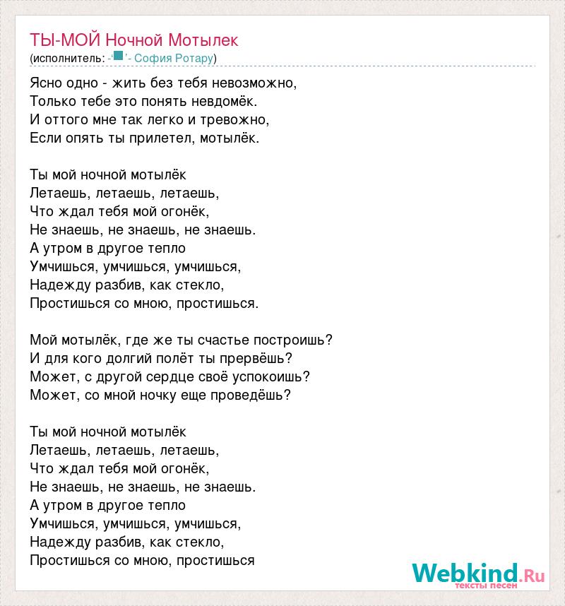 Ясно одно - жить без тебя невозможно, Только тебе это понять невдомёк. И оттого мне так легко и тревожно, Если опять ты прилетел, мотылёк. Ты мой ночной мотылёк Летаешь, летаешь, летаешь, Что ждал тебя мой огонёк, Не знаешь, не знаешь, не знаешь. А утром в другое тепло Умчишься, умчишься, умчишься, Надежду разбив, как стекло, Простишься со мною, простишься. Мой мотылёк, где же ты счастье построишь? И для кого долгий полёт ты прервёшь? Может, с другой сердце своё успокоишь? Может, со мной ночку еще проведёшь? Ты мой ночной мотылёк Летаешь, летаешь, летаешь, Что ждал тебя мой огонёк, Не знаешь, не знаешь, не знаешь. А утром в другое тепло Умчишься, умчишься, умчишься, Надежду разбив, как стекло, Простишься со мною, простишься