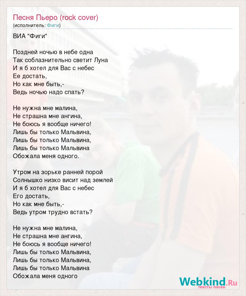 ВИА "Фиги" Поздней ночью в небе одна Так соблазнительно светит Луна И я б хотел для Вас с небес Ее достать, Но как мне быть,- Ведь ночью надо спать? Не нужна мне малина, Не страшна мне ангина, Не боюсь я вообще ничего! Лишь бы только Мальвина, Лишь бы только Мальвина, Лишь бы только Мальвина Обожала меня одного. Утром на зорьке ранней порой Солнышко низко висит над землей И я б хотел для Вас с небес Его достать, Но как мне быть,- Ведь утром трудно встать? Не нужна мне малина, Не страшна мне ангина, Не боюсь я вообще ничего! Лишь бы только Мальвина, Лишь бы только Мальвина, Лишь бы только Мальвина Обожала меня одного