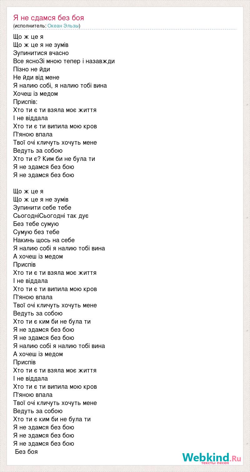 Що ж це я Що ж це я не зумів Зупинитися вчасно Все ясноЗі мною тепер і назавжди Пізно не йди Не йди від мене Я налию собі, я налию тобі вина Хочеш із медом Приспів: Хто ти є ти взяла моє життя І не віддала Хто ти є ти випила мою кров П'яною впала Твої очі кличуть хочуть мене Ведуть за собою Хто ти є? Ким би не була ти Я не здамся без бою Я не здамся без бою Що ж це я Що ж це я не зумів Зупинити себе тебе СьогодніСьогодні так дує Без тебе сумую Сумую без тебе Накинь щось на себе Я налию собі я налию тобі вина А хочеш із медом Приспів Хто ти є ти взяла моє життя І не віддала Хто ти є ти випила мою кров П'яною впала Твої очі кличуть хочуть мене Ведуть за собою Хто ти є ким би не була ти Я не здамся без бою Я не здамся без бою Я налию собі я налию тобі вина А хочеш із медом Приспів Хто ти є ти взяла моє життя І не віддала Хто ти є ти випила мою кров П'яною впала Твої очі кличуть хочуть мене Ведуть за собою Хто ти є ким би не була ти Я не здамся без бою Я не здамся без бою Я не здамся без бою Без боя