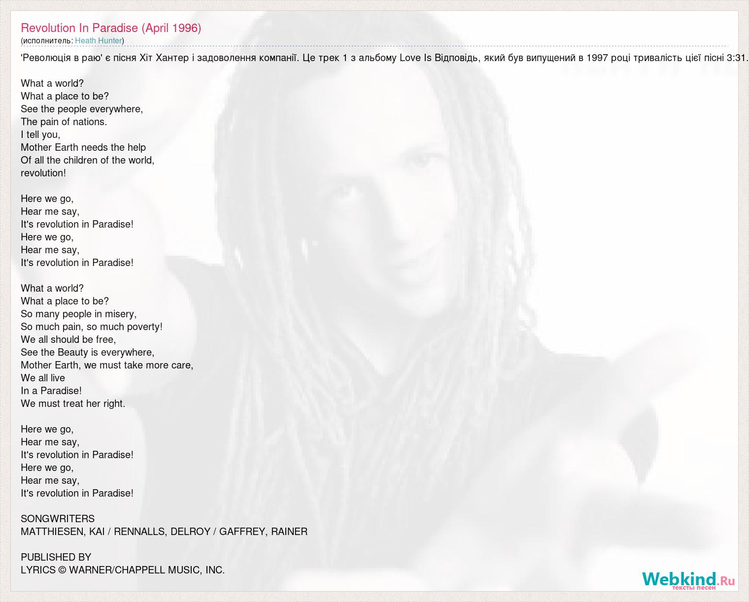 'Революція в раю' є пісня Хіт Хантер і задоволення компанії. Це трек 1 з альбому Love Is Відповідь, який був випущений в 1997 році тривалість цієї пісні 3:31. What a world? What a place to be? See the people everywhere, The pain of nations. I tell you, Mother Earth needs the help Of all the children of the world, revolution! Here we go, Hear me say, It's revolution in Paradise! Here we go, Hear me say, It's revolution in Paradise! What a world? What a place to be? So many people in misery, So much pain, so much poverty! We all should be free, See the Beauty is everywhere, Mother Earth, we must take more care, We all live In a Paradise! We must treat her right. Here we go, Hear me say, It's revolution in Paradise! Here we go, Hear me say, It's revolution in Paradise! SONGWRITERS MATTHIESEN, KAI / RENNALLS, DELROY / GAFFREY, RAINER PUBLISHED BY LYRICS © WARNER/CHAPPELL MUSIC, INC.