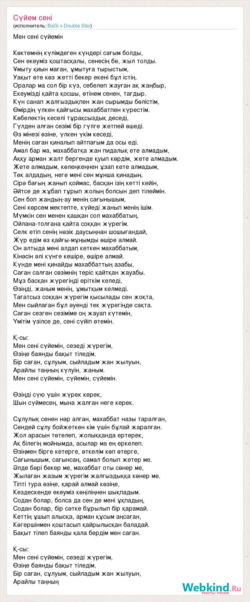 Мен сені сүйемін Көктемнің күлімдеген күндері сағым болды, Сен екеуміз қоштасқалы, сенесің бе, жыл толды. Ұмыту қиын маған, ұмытуға тырыстым, Уақыт өте көз жетті бекер екені бұл істің. Оралар ма сол бір күз, себелеп жауған ақ жаңбыр, Екеумізді қайта қосшы, өтінем сенен, тағдыр. Күн санап жалғыздықпен жан сырымды бөлістім, Өмірдің үлкен қайғысы махаббатпен күрестім. Көбелектің кеселі тұрақсыздық деседі, Гүлден алған сезімі бір гүлге жетпей өшеді. Өз мінезі өзіне, үлкен үкім кеседі, Менің саған қиналып айтпағым да осы еді. Амал бар ма, махаббатқа жан пидалық ете алмадым, Аққу арман жалт бергенде қуып көрдім, жете алмадым. Жете алмадым, көлеңкеңнен ұзап кете алмадым, Тек алдадың, неге мені сен мұнша қинадың. Сірә бағың жанып қоймас, басқан ізің кетті кейін, Әйтсе де жұбап тұрып жолың болсын деп тілеймін. Сен боп жандың-ау менің сағынышым, Сені көрсем мектепте, күйеді жанып менің ішім. Мүмкін сен менен қашқан сол махаббатың, Ойлана-толғана қайта соққан жүрегім. Селк етіп сенің нәзік даусыңнан шошығандай, Жүр едім өз қайғы-мұңымды өшіре алмай. Он алтыда мені алдап кеткен махаббатым, Кінәсін әлі күнге кешіре, өшіре алмай. Күнде мені қинайды махаббаттың азабы, Саған салған сөзімнің теріс қайтқан жауабы. Мұз басқан жүрегіңді еріткім келеді, Өзіңді, жаным менің, ұмытқым келмеді. Тағатсыз соққан жүрегім қысылады сен жоқта, Мен сыйлаған бұл әуенді тек жүрегіңде сақта. Саған сезген сезіміме оң жауап күтемін, Үмітім үзілсе де, сені сүйіп өтемін. Қ-сы: Мен сені сүйемін, сезеді жүрегім, Өзіңе баянды бақыт тіледім. Бір саған, сұлуым, сыйладым жан жылуын, Арайлы таңның күлуін, жаным. Мен сені сүйемін, сүйемін, сүйемін. Өзіңді сүю үшін жүрек керек, Шын сүймесең, мына жалған неге керек. Сұлулық сенен нәр алған, махаббат назы таралған, Сендей сұлу бойжеткен кім үшін бұлай жаралған. Жол арасын төтелеп, жолыққанда ертерек, Ақ білегің мойнымда, асылар ма ең еркелеп. Өзіңмен бірге кетерге, өткелім көп өтерге, Сағынышым, сағынсаң, самал болып жетер ме. Әлде бәрі бекер ме, махаббат оты сөнер ме, Жылаған жазым жүрегім жалғыздыққа көнер ме. Тіпті тура өзіңе, қарай алмай көзіңе, Кездескенде екеуміз көңіліңнен шықпадым. Содан болар, болса да сен де мені ұқпадың, Содан болар, бір сәтке бұрылып бір қарамай. Кеттің ұшып алысқа, арман құсым аңсаған, Көгершінмен қоштасып қайрылысқан баладай. Бақыт тілеп баянды қала бердім мен саған. Қ-сы: Мен сені сүйемін, сезеді жүрегім, Өзіңе баянды бақыт тіледім. Бір саған, сұлуым, сыйладым жан жылуын, Арайлы таңның