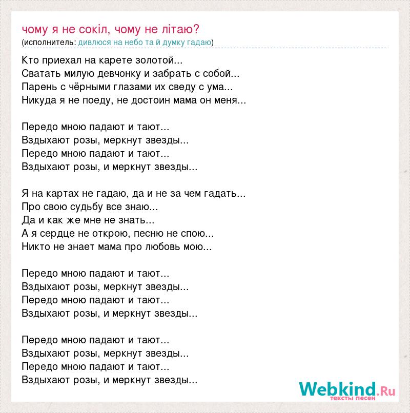Кто приехал на карете золотой... Сватать милую девчонку и забрать с собой... Парень с чёрными глазами их сведу с ума... Никуда я не поеду, не достоин мама он меня... Передо мною падают и тают... Вздыхают розы, меркнут звезды... Передо мною падают и тают... Вздыхают розы, и меркнут звезды... Я на картах не гадаю, да и не за чем гадать... Про свою судьбу все знаю... Да и как же мне не знать... А я сердце не открою, песню не спою... Никто не знает мама про любовь мою... Передо мною падают и тают... Вздыхают розы, меркнут звезды... Передо мною падают и тают... Вздыхают розы, и меркнут звезды... Передо мною падают и тают... Вздыхают розы, меркнут звезды... Передо мною падают и тают... Вздыхают розы, и меркнут звезды...