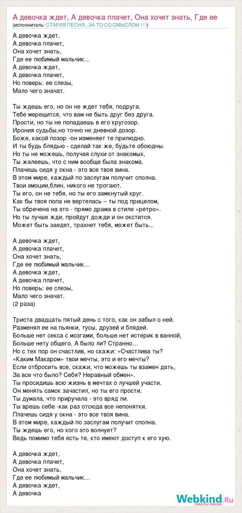 А девочка ждет, А девочка плачет, Она хочет знать, Где ее любимый мальчик… А девочка ждет, А девочка плачет, Но поверь: ее слезы, Мало чего значат. Ты ждешь его, но он не ждет тебя, подруга. Тебе мерещится, что вам не быть друг без друга. Прости, но ты не попадаешь в его кругозор. Ирония судьбы,но точно не дневной дозор. Боже, какой позор -он изменяет те прилюдно. И ты будь блядью - сделай так же, будьте обоюдны. Но ты не можешь, получая слухи от знакомых, Ты жалеешь, что с ним вообще была знакома. Плачешь сидя у окна - это все твоя вина. В этом мире, каждый по заслугам получит сполна. Твои эмоции,блин, никого не трогают. Ты его, он не тебя, но ты его замкнутый круг. Как бы твоя попа не вертелась – ты под прицелом, Ты обречена на это - прямо драма в стиле «ретро». Но ты лучше жди, пройдут дожди и он окстится. Может быть заедет, трахнет тебя, может быть... А девочка ждет, А девочка плачет, Она хочет знать, Где ее любимый мальчик… А девочка ждет, А девочка плачет, Но поверь: ее слезы, Мало чего значат. (2 раза) Триста двадцать пятый день с того, как он забыл о ней. Разменял ее на пьянки, тусы, друзей и блядей. Больше нет секса с мозгами, больше нет истерик в ванной, Больше нету общего. А было ли? Странно… Но с тех пор он счастлив, но скажи: «Счастлива ты? «Каким Макаром» твои мечты, это и его мечты? Если отбросить все, скажи, что можешь ты взамен дать, За все что было? Себя? Неравный обмен». Ты просидишь всю жизнь в мечтах о лучшей участи. Он менять самок зачастил, но ты его прости. Ты думала, что приручала - это вряд ли. Ты врешь себе -как раз отсюда все непонятки. Плачешь сидя у окна - это все твоя вина. В этом мире, каждый по заслугам получит сполна. Ты ждешь его, но кого это волнует? Ведь помимо тебя есть те, кто имеют доступ к его хую. А девочка ждет, А девочка плачет, Она хочет знать, Где ее любимый мальчик… А девочка ждет, А девочка