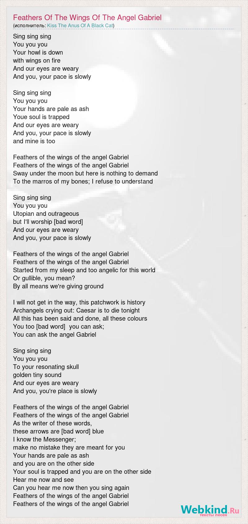 Sing sing sing You you you Your howl is down with wings on fire And our eyes are weary And you, your pace is slowly Sing sing sing You you you Your hands are pale as ash Youe soul is trapped And our eyes are weary And you, your pace is slowly and mine is too Feathers of the wings of the angel Gabriel Feathers of the wings of the angel Gabriel Sway under the moon but here is nothing to demand To the marros of my bones; I refuse to understand Sing sing sing You you you Utopian and outrageous but I'll worship [bad word] And our eyes are weary And you, your pace is slowly Feathers of the wings of the angel Gabriel Feathers of the wings of the angel Gabriel Started from my sleep and too angelic for this world Or gullible, you mean? By all means we're giving ground I will not get in the way, this patchwork is history Archangels crying out: Caesar is to die tonight All this has been said and done, all these colours You too [bad word] you can ask; You can ask the angel Gabriel Sing sing sing You you you To your resonating skull golden tiny sound And our eyes are weary And you, you're place is slowly Feathers of the wings of the angel Gabriel Feathers of the wings of the angel Gabriel As the writer of these words, these arrows are [bad word] blue I know the Messenger; make no mistake they are meant for you Your hands are pale as ash and you are on the other side Your soul is trapped and you are on the other side Hear me now and see Can you hear me now then you sing again Feathers of the wings of the angel Gabriel Feathers of the wings of the angel Gabriel