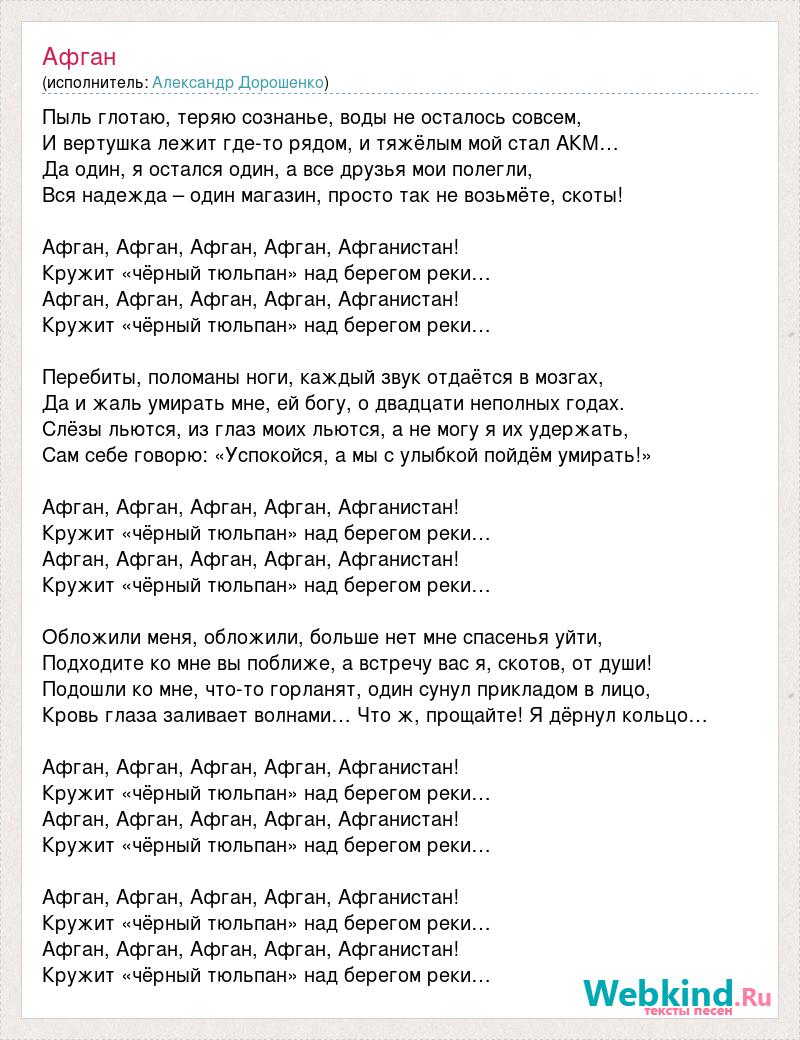 Пыль глотаю, теряю сознанье, воды не осталось совсем, И вертушка лежит где-то рядом, и тяжёлым мой стал АКМ… Да один, я остался один, а все друзья мои полегли, Вся надежда – один магазин, просто так не возьмёте, скоты! Афган, Афган, Афган, Афган, Афганистан! Кружит «чёрный тюльпан» над берегом реки… Афган, Афган, Афган, Афган, Афганистан! Кружит «чёрный тюльпан» над берегом реки… Перебиты, поломаны ноги, каждый звук отдаётся в мозгах, Да и жаль умирать мне, ей богу, о двадцати неполных годах. Слёзы льются, из глаз моих льются, а не могу я их удержать, Сам себе говорю: «Успокойся, а мы с улыбкой пойдём умирать!» Афган, Афган, Афган, Афган, Афганистан! Кружит «чёрный тюльпан» над берегом реки… Афган, Афган, Афган, Афган, Афганистан! Кружит «чёрный тюльпан» над берегом реки… Обложили меня, обложили, больше нет мне спасенья уйти, Подходите ко мне вы поближе, а встречу вас я, скотов, от души! Подошли ко мне, что-то горланят, один сунул прикладом в лицо, Кровь глаза заливает волнами… Что ж, прощайте! Я дёрнул кольцо… Афган, Афган, Афган, Афган, Афганистан! Кружит «чёрный тюльпан» над берегом реки… Афган, Афган, Афган, Афган, Афганистан! Кружит «чёрный тюльпан» над берегом реки… Афган, Афган, Афган, Афган, Афганистан! Кружит «чёрный тюльпан» над берегом реки… Афган, Афган, Афган, Афган, Афганистан! Кружит «чёрный тюльпан» над берегом реки…