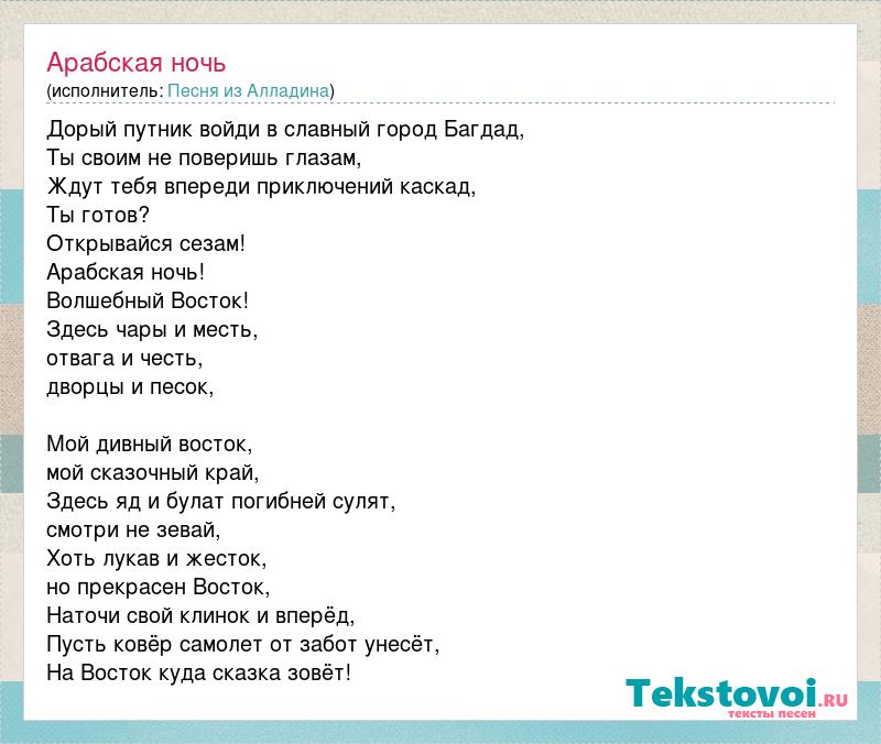 Дорый путник войди в славный город Багдад, Ты своим не поверишь глазам, Ждут тебя впереди приключений каскад, Ты готов? Открывайся сезам! Арабская ночь! Волшебный Восток! Здесь чары и месть, отвага и честь, дворцы и песок, Мой дивный восток, мой сказочный край, Здесь яд и булат погибней сулят, смотри не зевай, Хоть лукав и жесток, но прекрасен Восток, Наточи свой клинок и вперёд, Пусть ковёр самолет от забот унесёт, На Восток куда сказка зовёт!