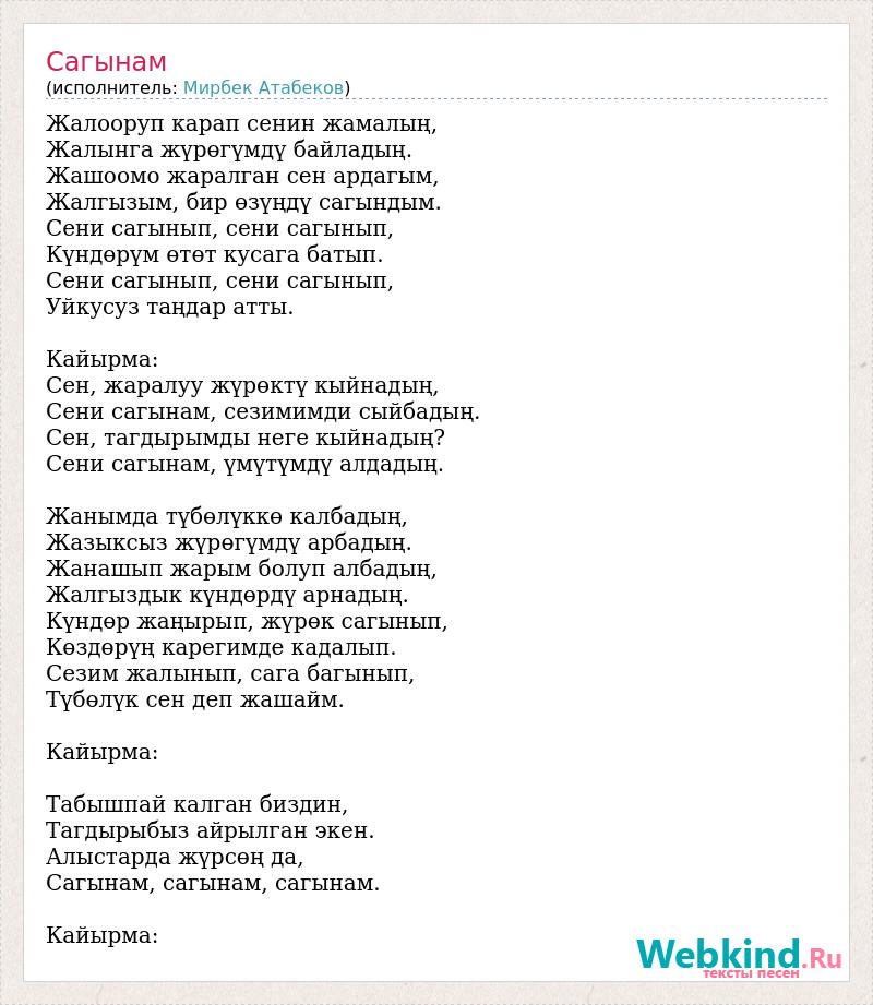 Жалооруп карап сенин жамалың, Жалынга жүрөгүмдү байладың. Жашоомо жаралган сен ардагым, Жалгызым, бир өзүңдү сагындым. Сени сагынып, сени сагынып, Күндөрүм өтөт кусага батып. Сени сагынып, сени сагынып, Уйкусуз таңдар атты. Кайырма: Сен, жаралуу жүрөктү кыйнадың, Сени сагынам, сезимимди сыйбадың. Сен, тагдырымды неге кыйнадың? Сени сагынам, үмүтүмдү алдадың. Жанымда түбөлүккө калбадың, Жазыксыз жүрөгүмдү арбадың. Жанашып жарым болуп албадың, Жалгыздык күндөрдү арнадың. Күндөр жаңырып, жүрөк сагынып, Көздөрүң карегимде кадалып. Сезим жалынып, сага багынып, Түбөлүк сен деп жашайм. Кайырма: Табышпай калган биздин, Тагдырыбыз айрылган экен. Алыстарда жүрсөң да, Сагынам, сагынам, сагынам. Кайырма: